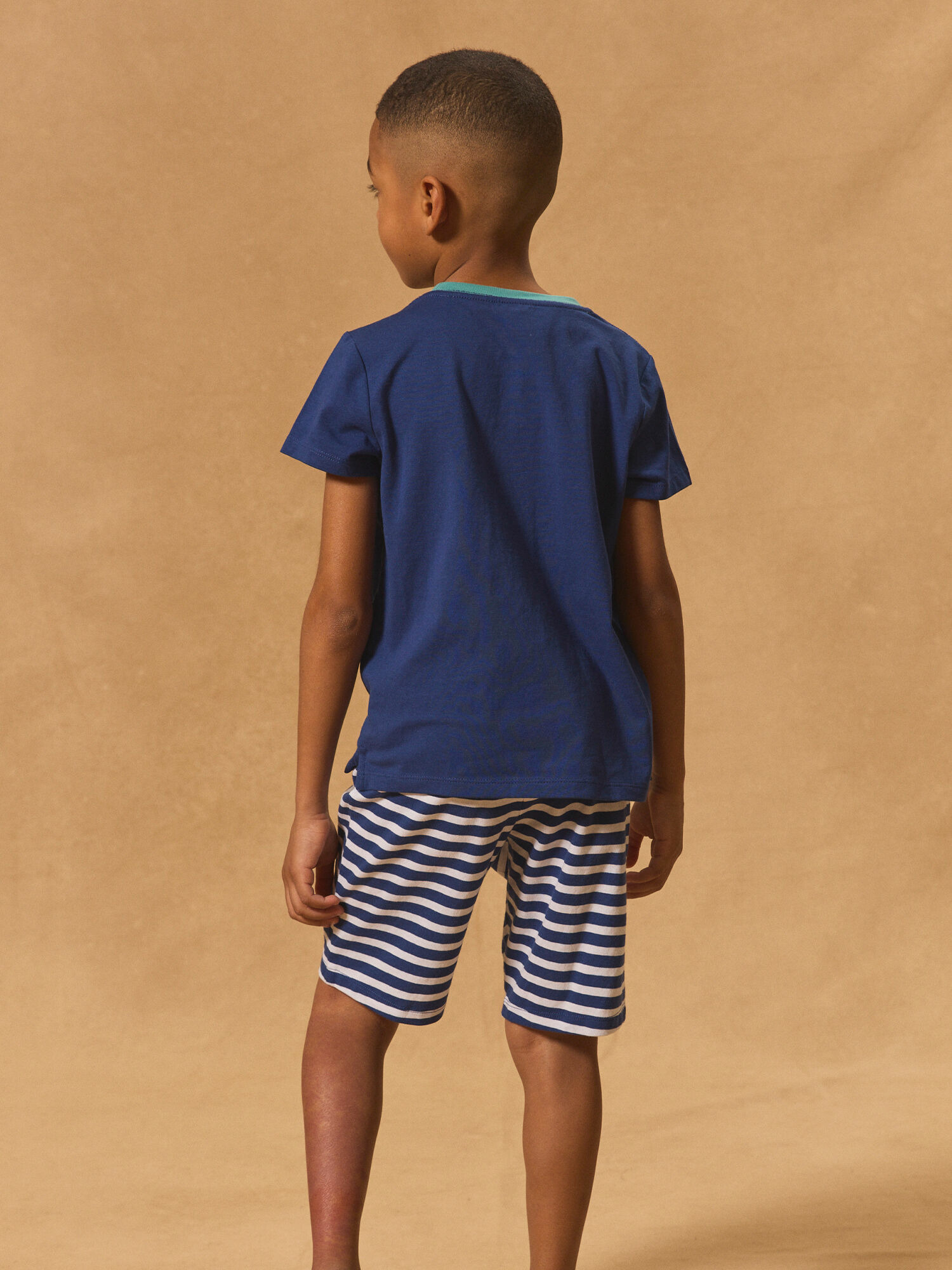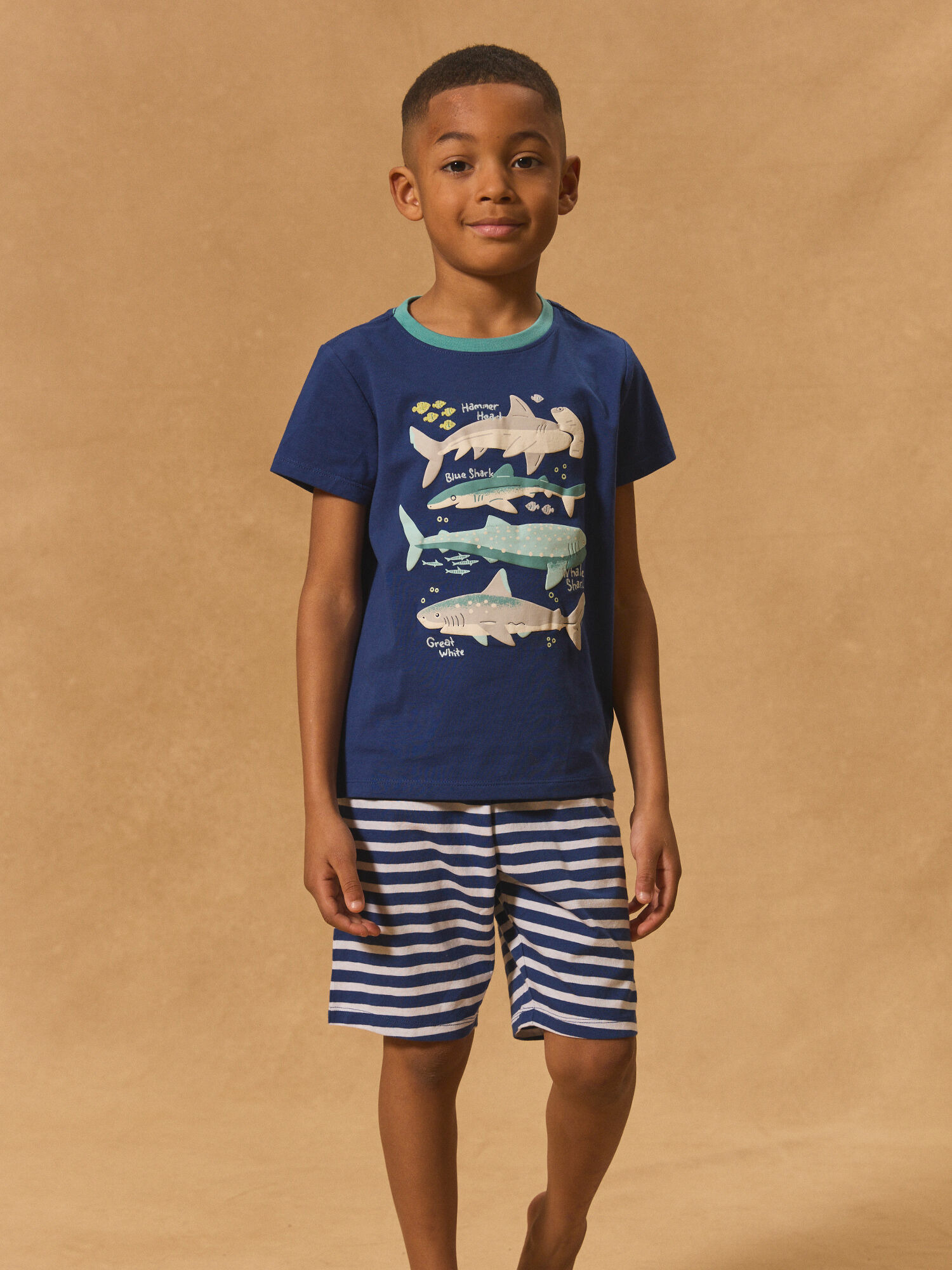 Ce pyjama associe un haut imprimé requin, dynamique et original, à un bas rayé aux couleurs harmonieuses. La taille élastiquée garantit un ajustement parfait et un maintien optimal tout au long de la nuit. Conçu pour accompagner les petits explorateurs dans leurs moments de repos, il fait partie de la collection Nuit, pensée pour allier style et bien-être.