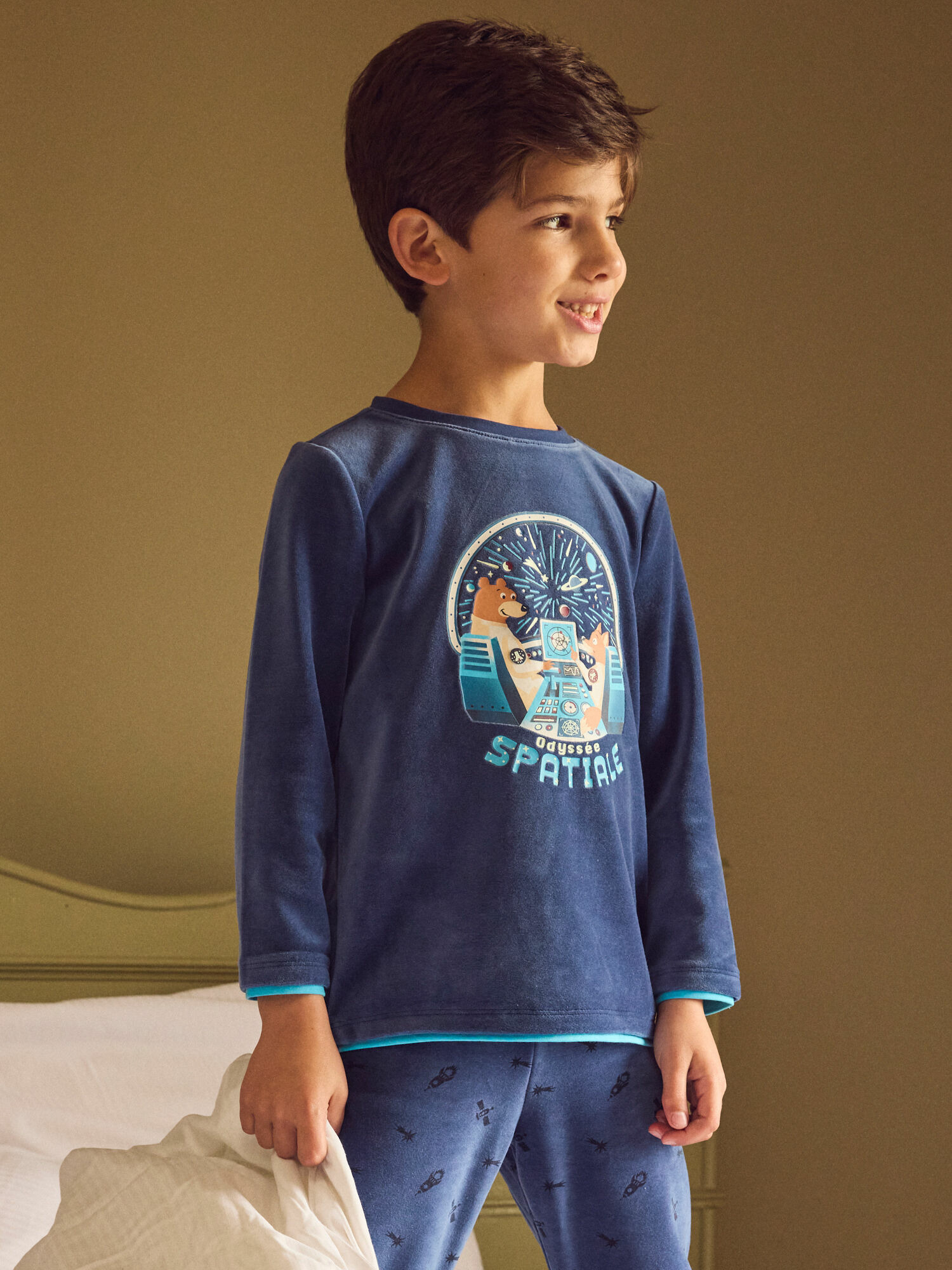 Confectionné dans un velours doux et chaud, ce pyjama fait partie de la collection Nuit de Sergent Major, pensée pour accompagner les enfants dans leurs moments de repos. Le haut arbore un imprimé espace avec un effet phosphorescent qui s’illumine dans le noir, tandis que le bas est décoré de fusées dynamiques, stimulant l’imagination. La matière allie douceur et respect de l’environnement grâce à sa composition en coton biologique et à au moins 20 % de matières recyclées.
