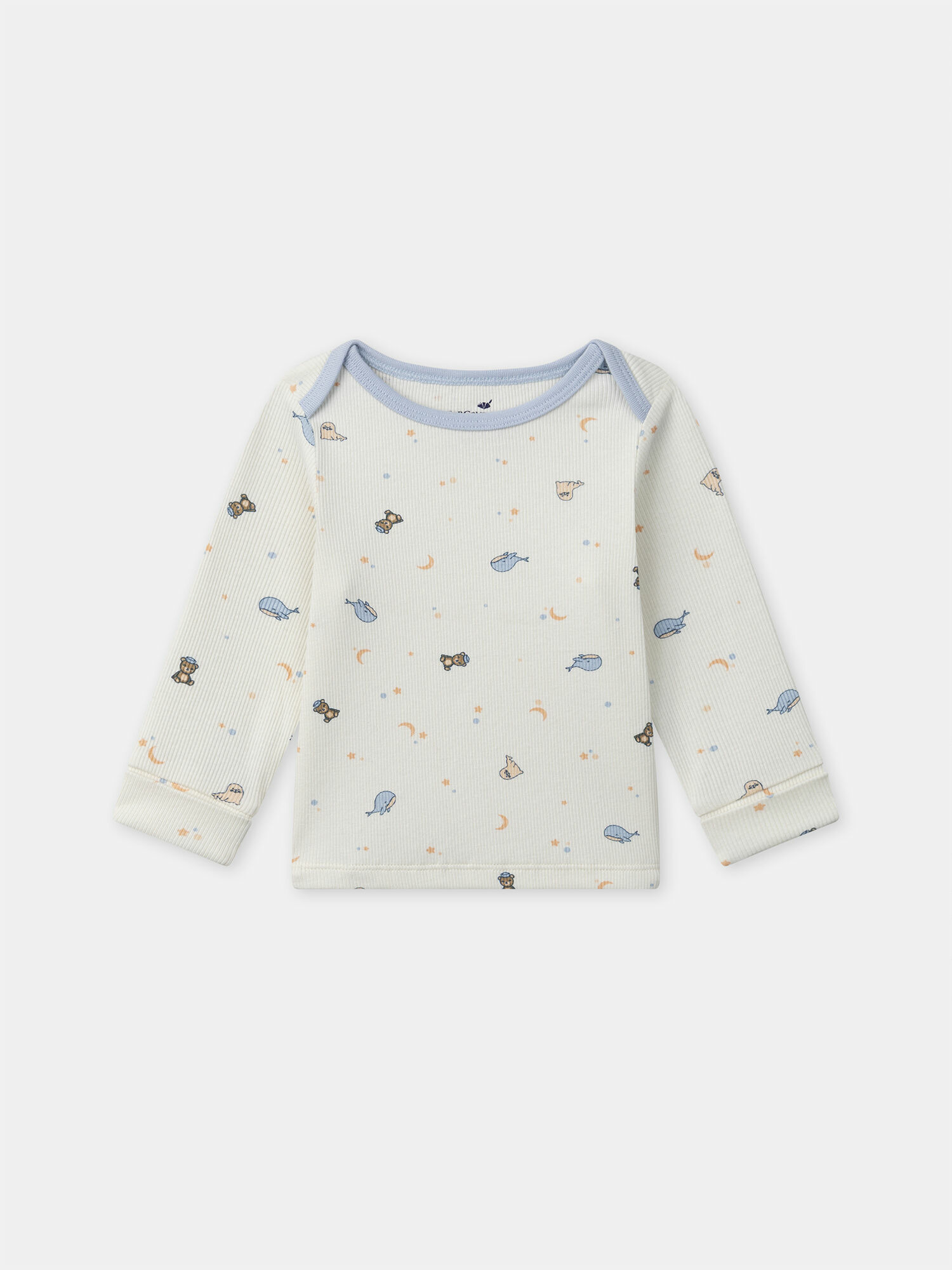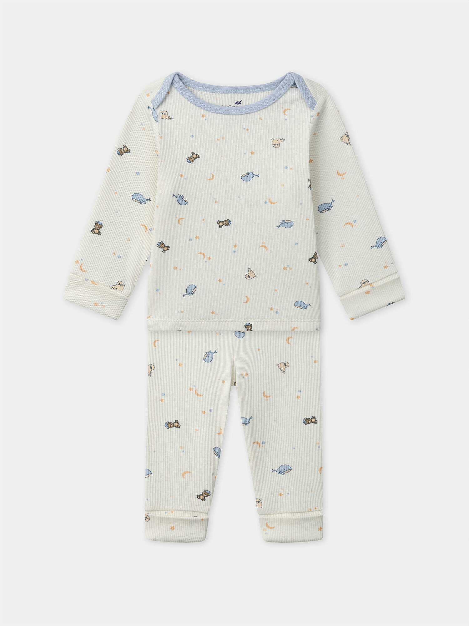 Confectionné en coton biologique, ce pyjama à côtes blanc crème séduit par son toucher doux et sa respirabilité idéale pour la peau sensible des tout-petits. Les motifs baleines, ours et phoques dans des tons bleu ciel, beige orangé et brun apportent une touche ludique et apaisante. Le liseré en jersey bleu ciel au col souligne l’élégance discrète de ce vêtement pensé pour le bien-être de bébé.