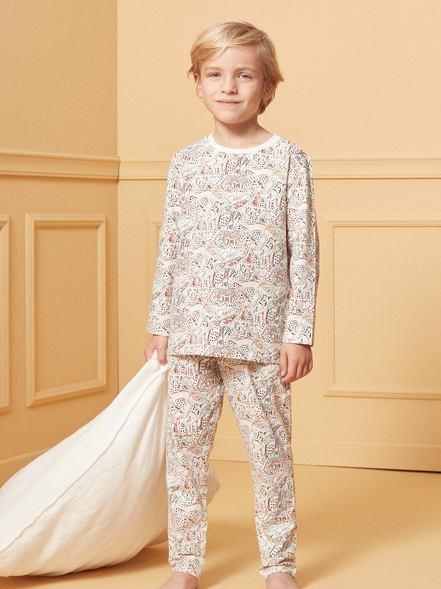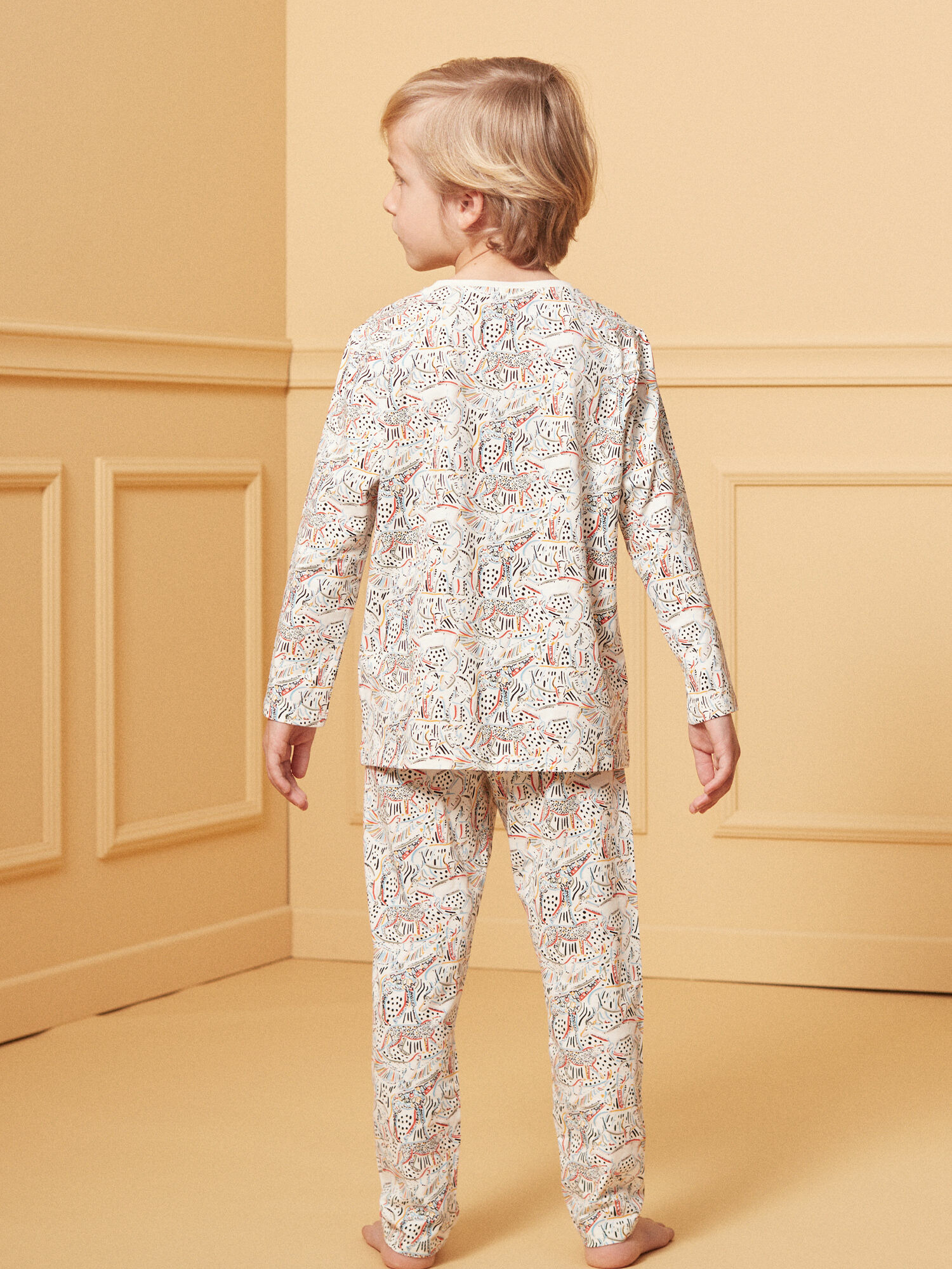 Confectionné en jersey souple, ce pyjama arbore un motif savane aux couleurs chaudes mêlant lions, girafes et éléphants. Chaque détail évoque une ambiance chaleureuse et apaisante, idéale pour accompagner les rêves d’exploration nocturne. La matière légère et extensible assure un confort optimal tout au long de la nuit, sans contrainte.