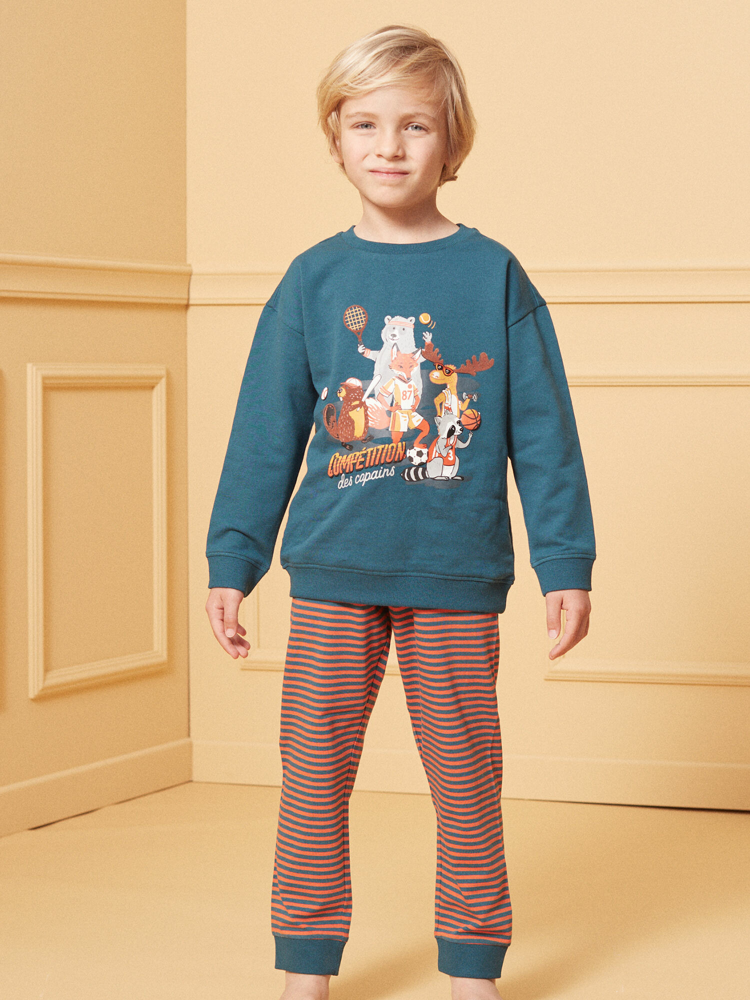 Composé d’un haut en molleton gratté imprimé et d’un bas en jersey rayé, ce pyjama est signé Sergent Major. Référence produit LUISPOAGE / 24H5PG36PYJ714. Pour plus d’informations sur ses qualités environnementales, consultez la fiche produit dédiée.