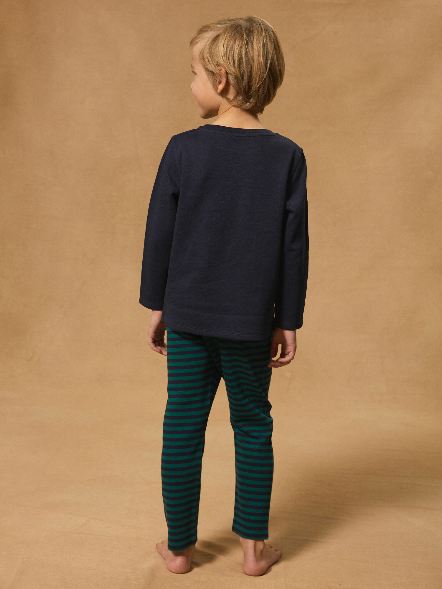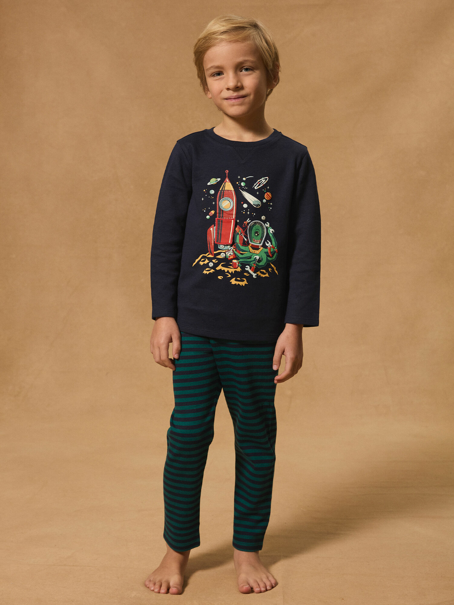 Fabriqué en tissu tubique, ce pyjama est doté d’une ouverture par boutons pressions au niveau de l’épaule et d’un pantalon à motif rayon. Il est proposé dans un bleu marine profond, signature de la collection Espace. Pour découvrir ses qualités environnementales, vous pouvez consulter la fiche produit dédiée.