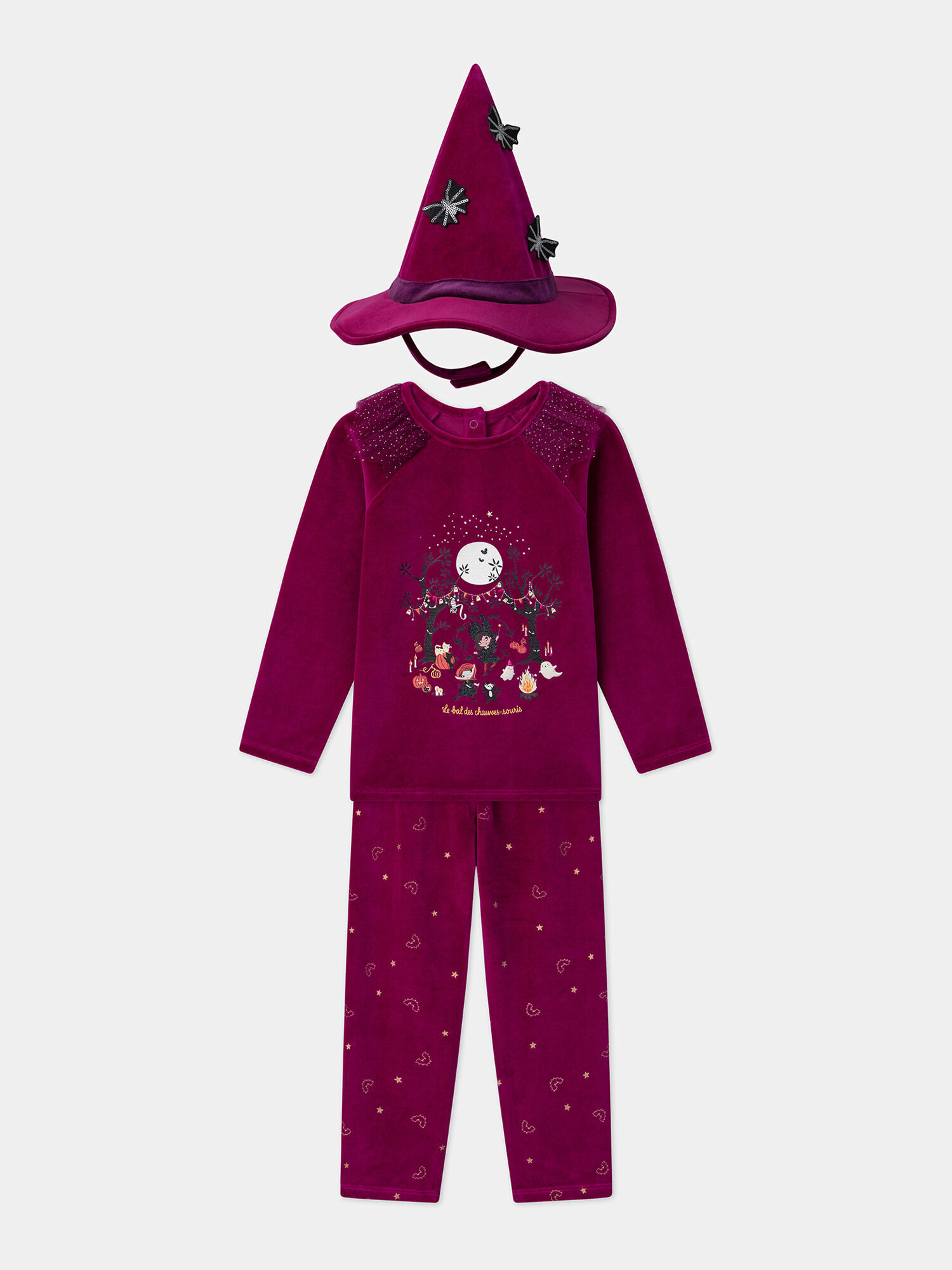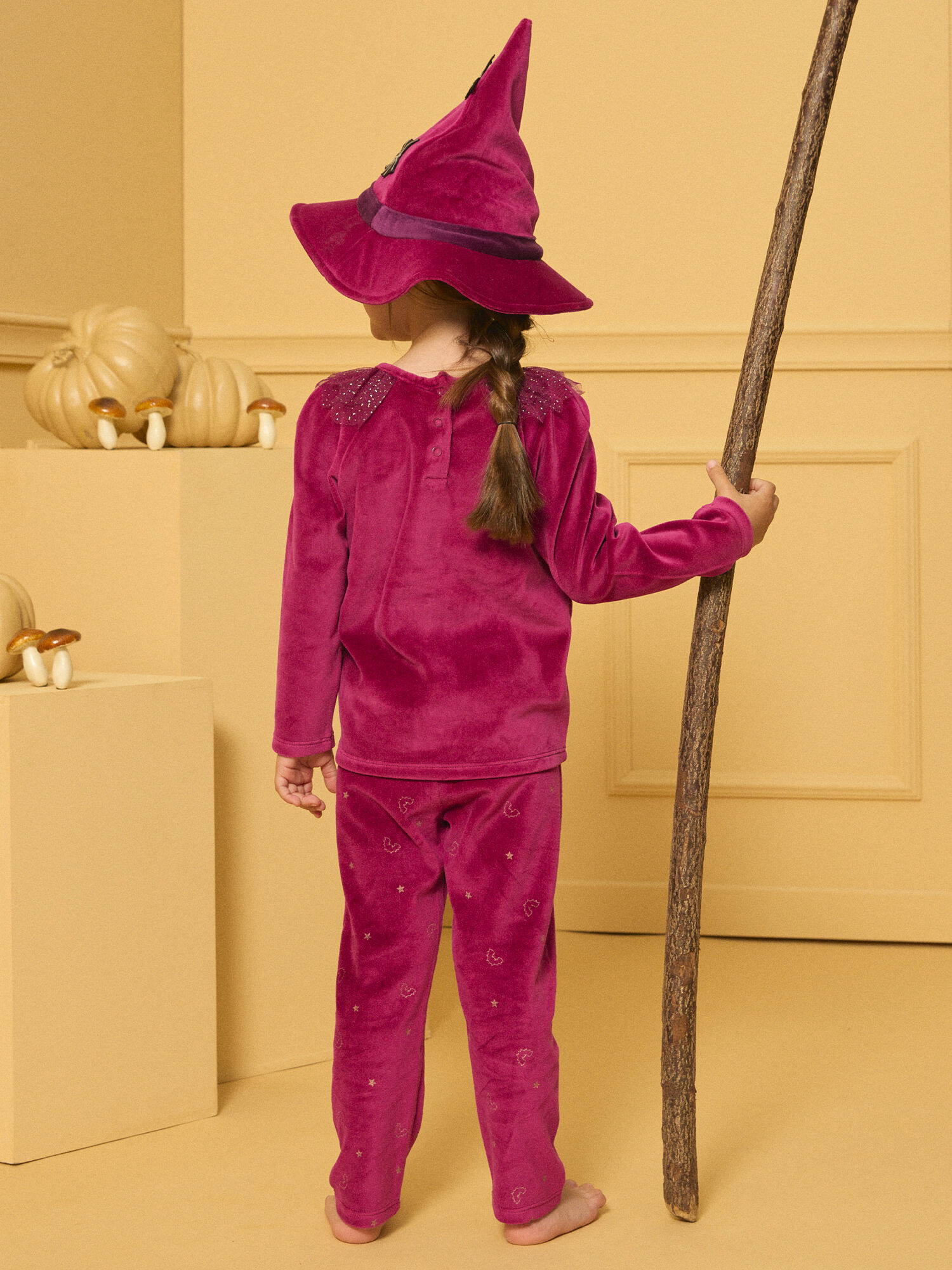 Ce pyjama se distingue par ses volants en tulle délicats aux épaules et son imprimé Petites sorcières agrémenté de détails phosphorescents qui brillent dans le noir. Le chapeau pointu, orné d’une chauve-souris en 3D, se transforme astucieusement en sac pour récolter les bonbons, tandis que le bas de pyjama est décoré de chauves-souris dorées, pour un ensemble à la fois ludique et élégant. Parfait pour les soirées d’Halloween ou pour prolonger la fête à la maison.