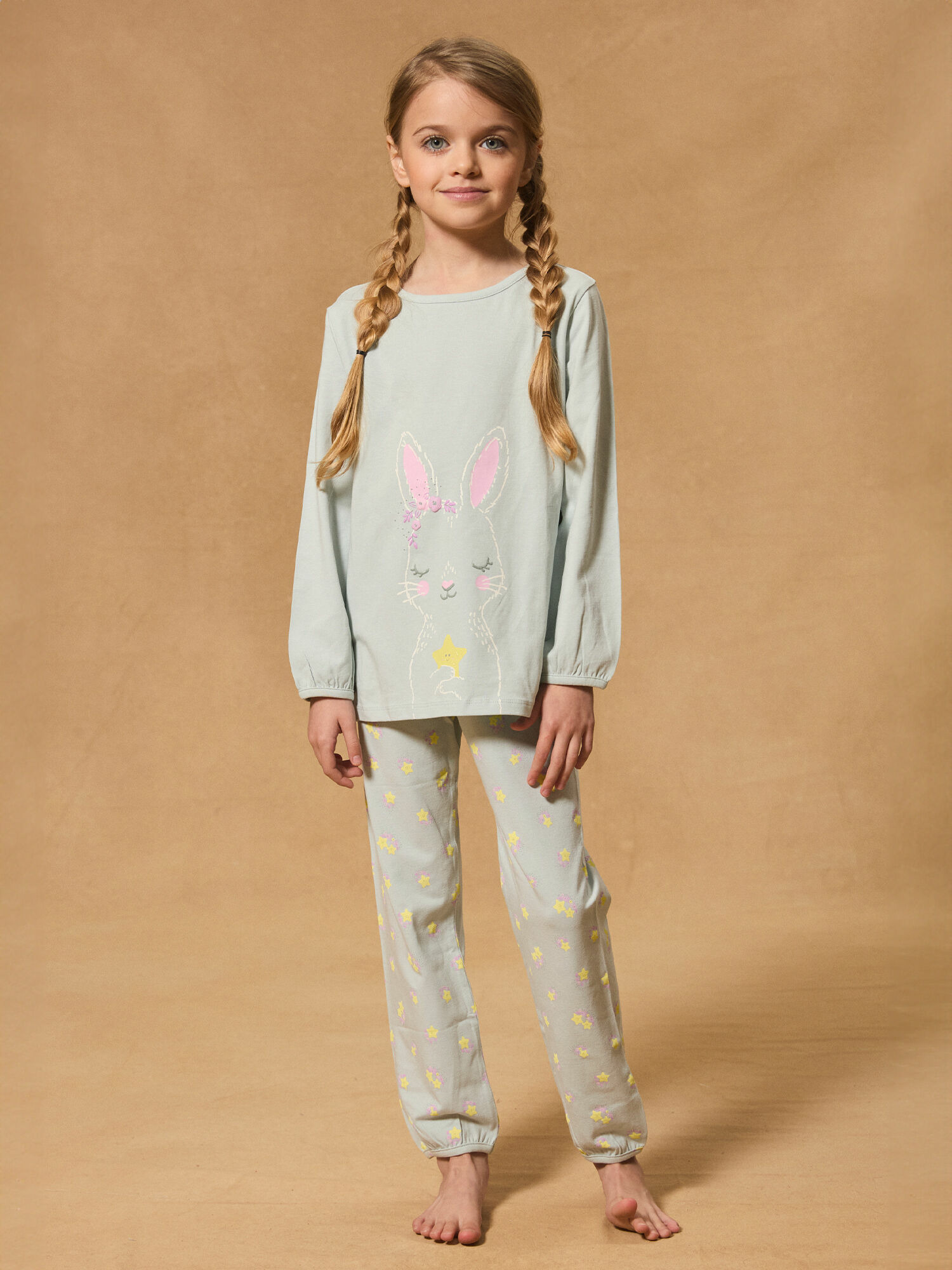 Composé à 100 % de coton jersey, ce modèle présente un imprimé lapin et des étoiles pailletées sur le bas du pantalon. La coupe est ajustée pour un maintien parfait sans gêner les mouvements. Retrouvez plus d’informations sur ses qualités environnementales en cliquant sur le lien de la fiche produit.