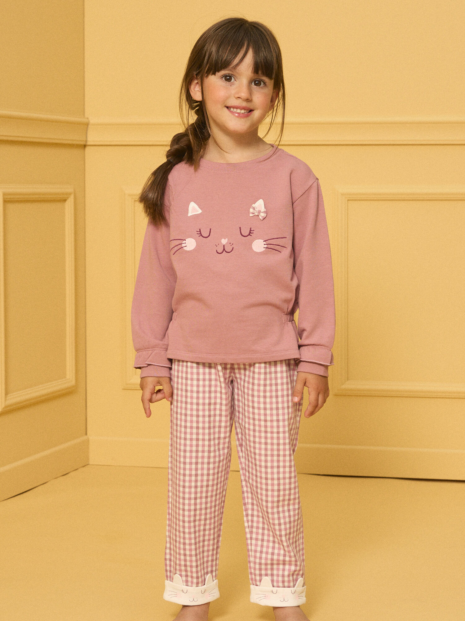 Haut en molleton gratté à l’intérieur, oreilles de chat en 3D, détails resserrés en bas de manches et de vêtement, pantalon en twill gratté, revers chat en jersey. Produit issu de la Collection NUIT. Référence : LECOETTE / 24H5PF41PYJ329.