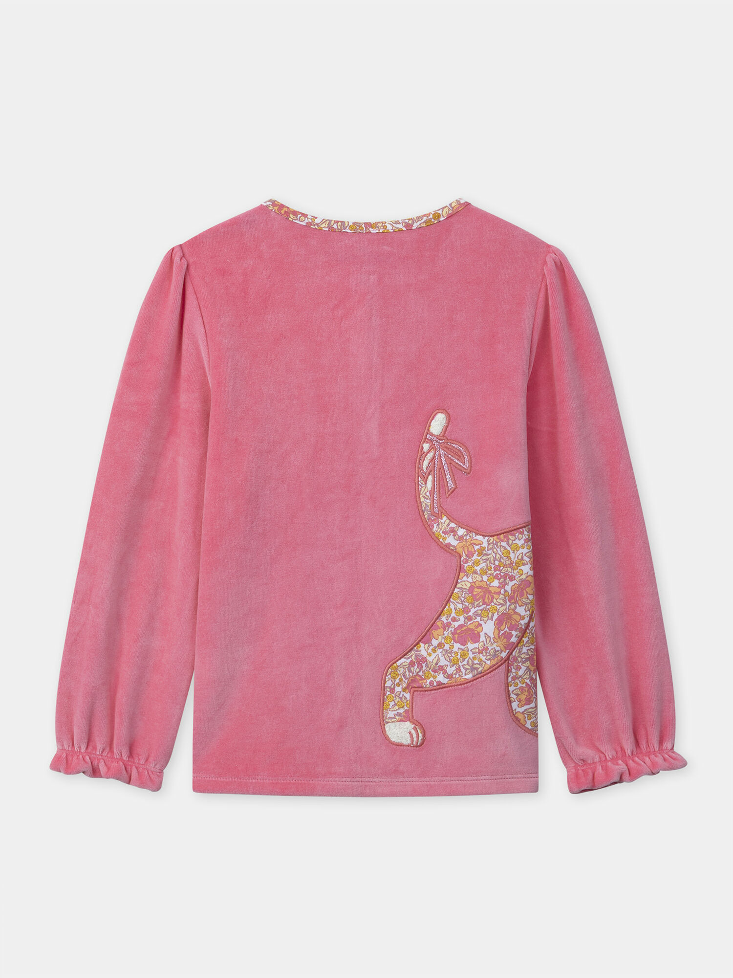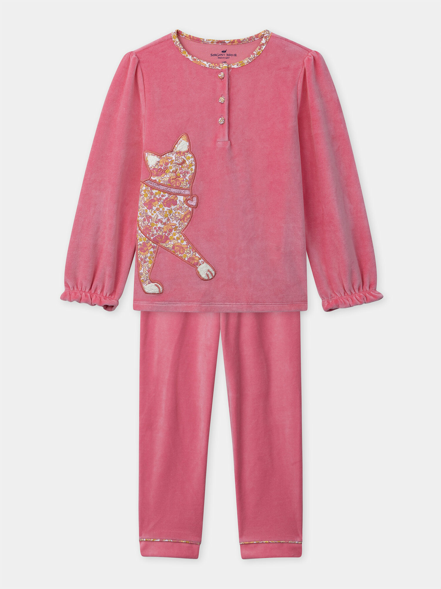 Offrez à votre fille des nuits douces et stylées avec ce pyjama rose en velours, orné d’un patch chat en jersey fleuri. Un équilibre parfait entre confort et charme pour des soirées cocooning réussies.
