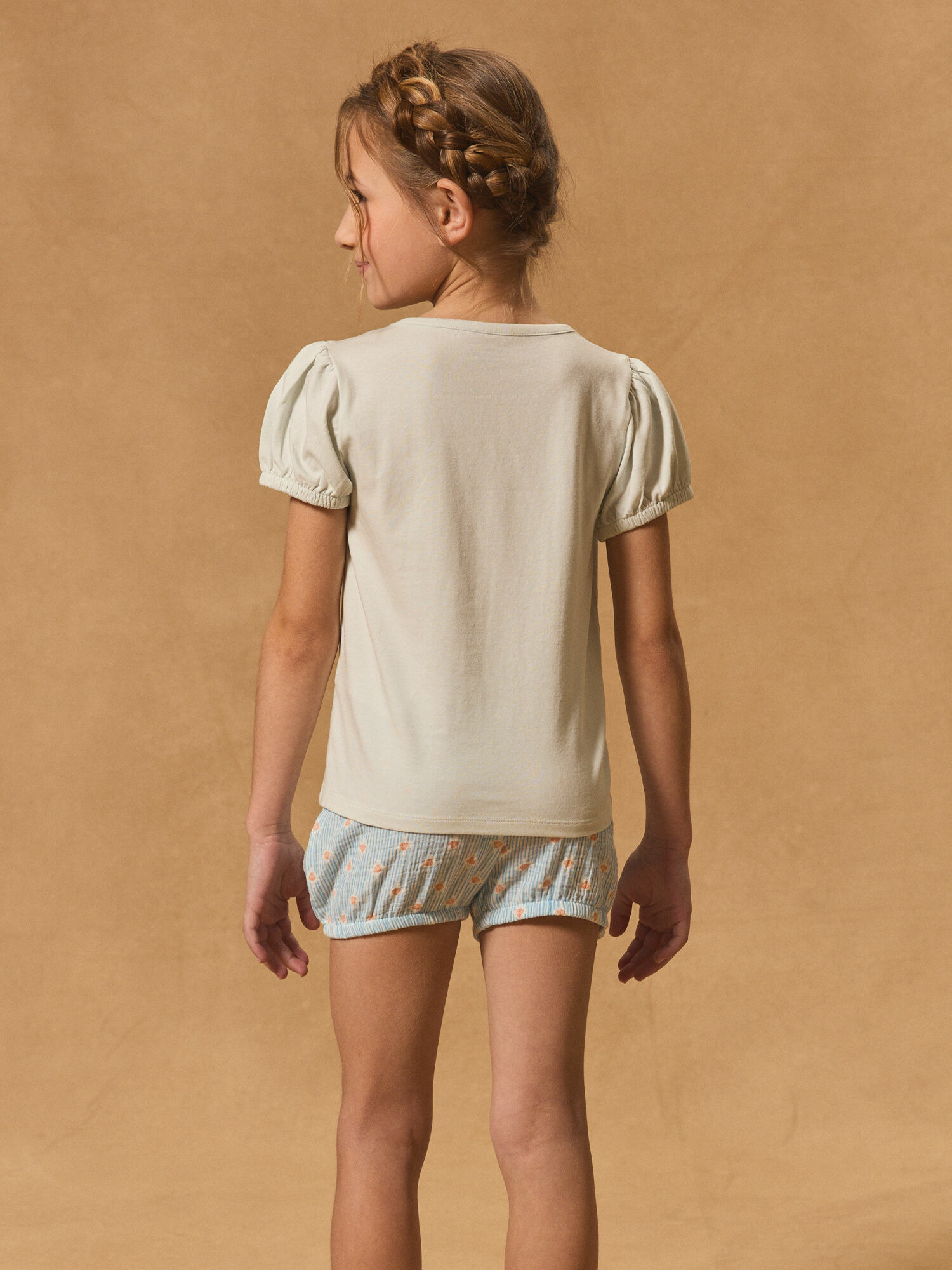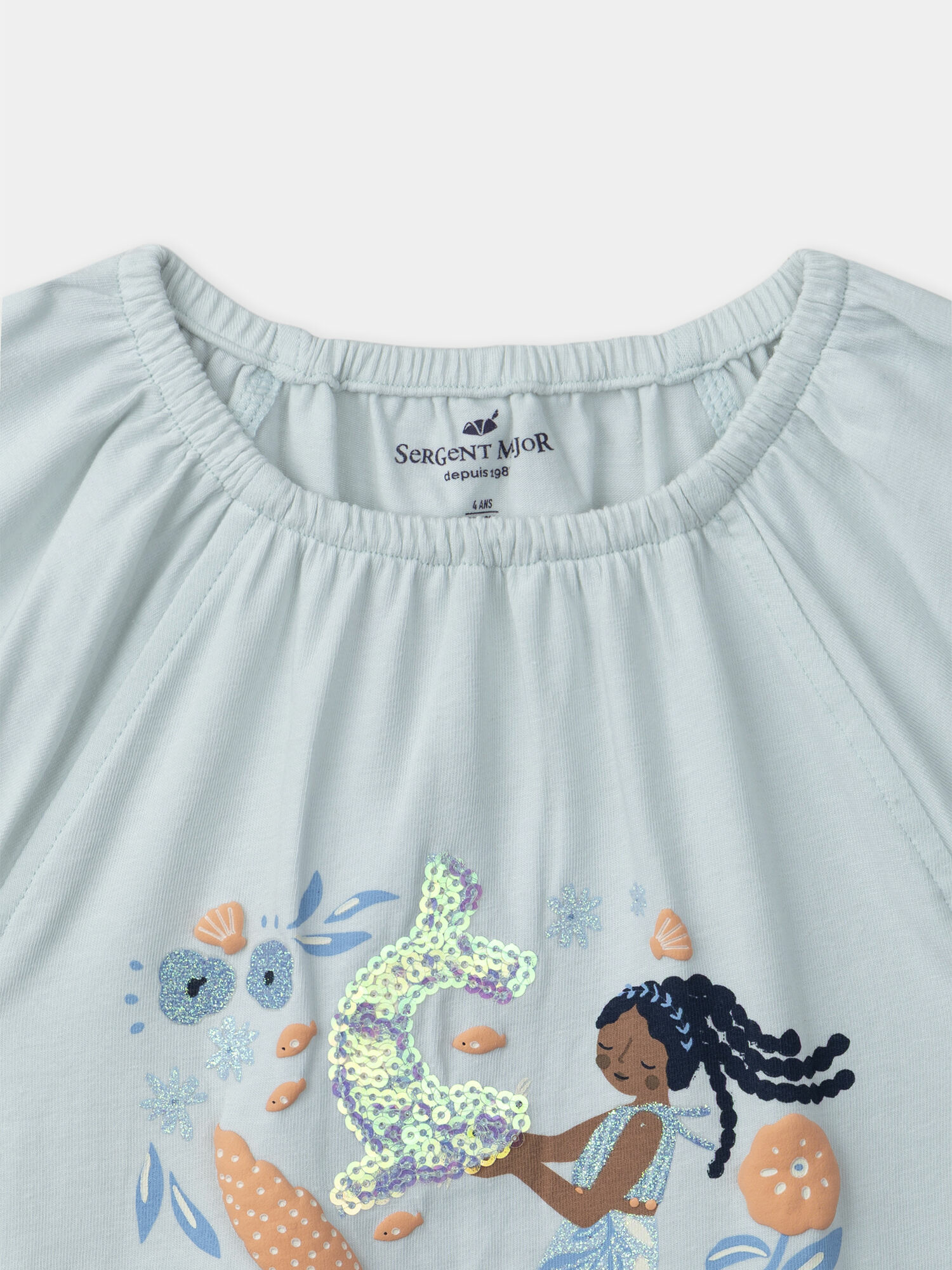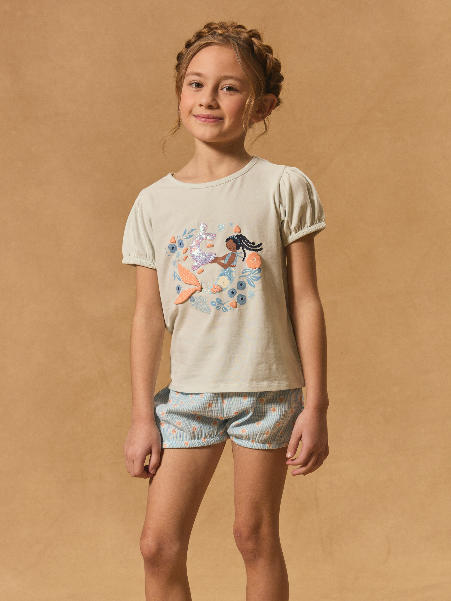 Le haut en jersey offre une sensation agréable sur la peau, sublimé par une encolure élastiquée et des manches ballons qui apportent une touche de légèreté et de modernité. L’imprimé sirène en paillettes et sequins capte la lumière pour un effet magique, tandis que le short bleu en gaze de coton, orné d’un imprimé coquillage, complète ce look estival et frais.