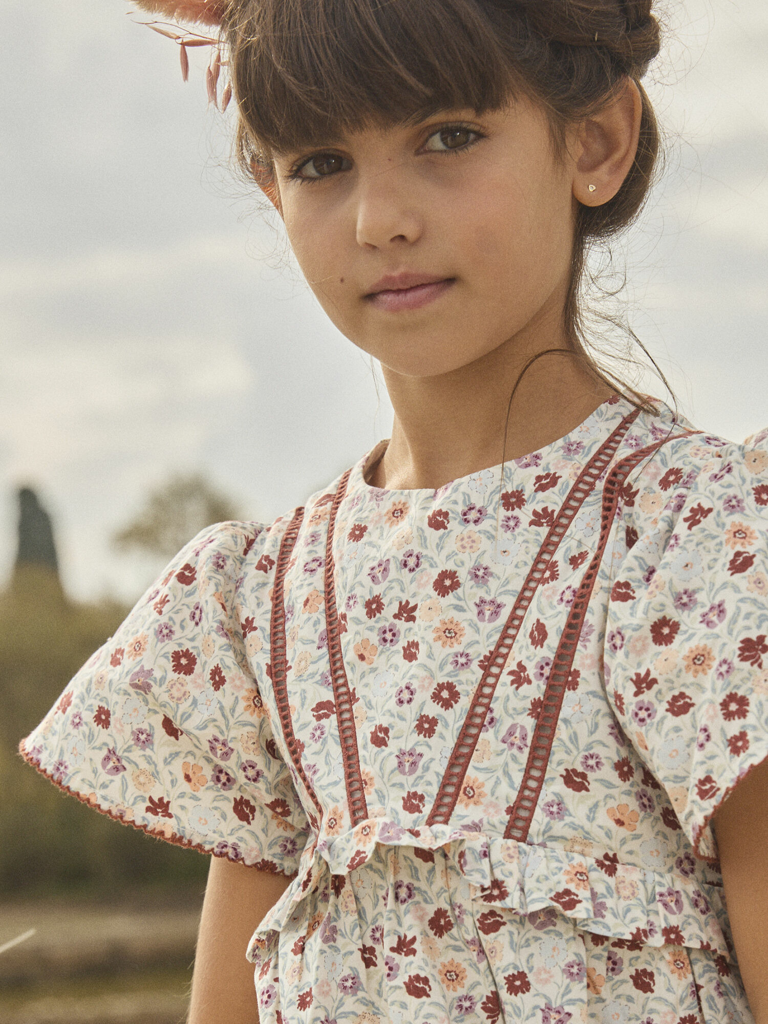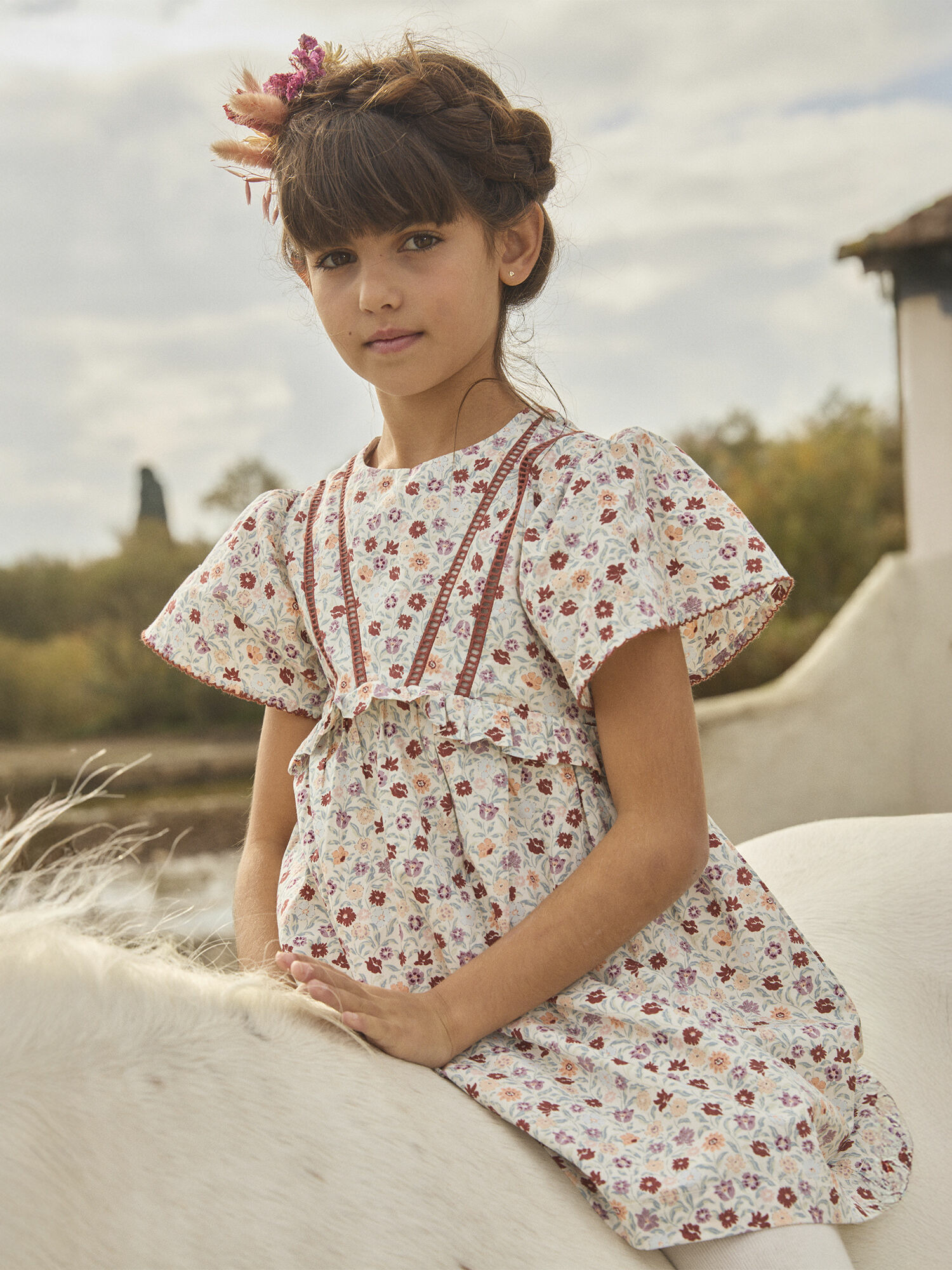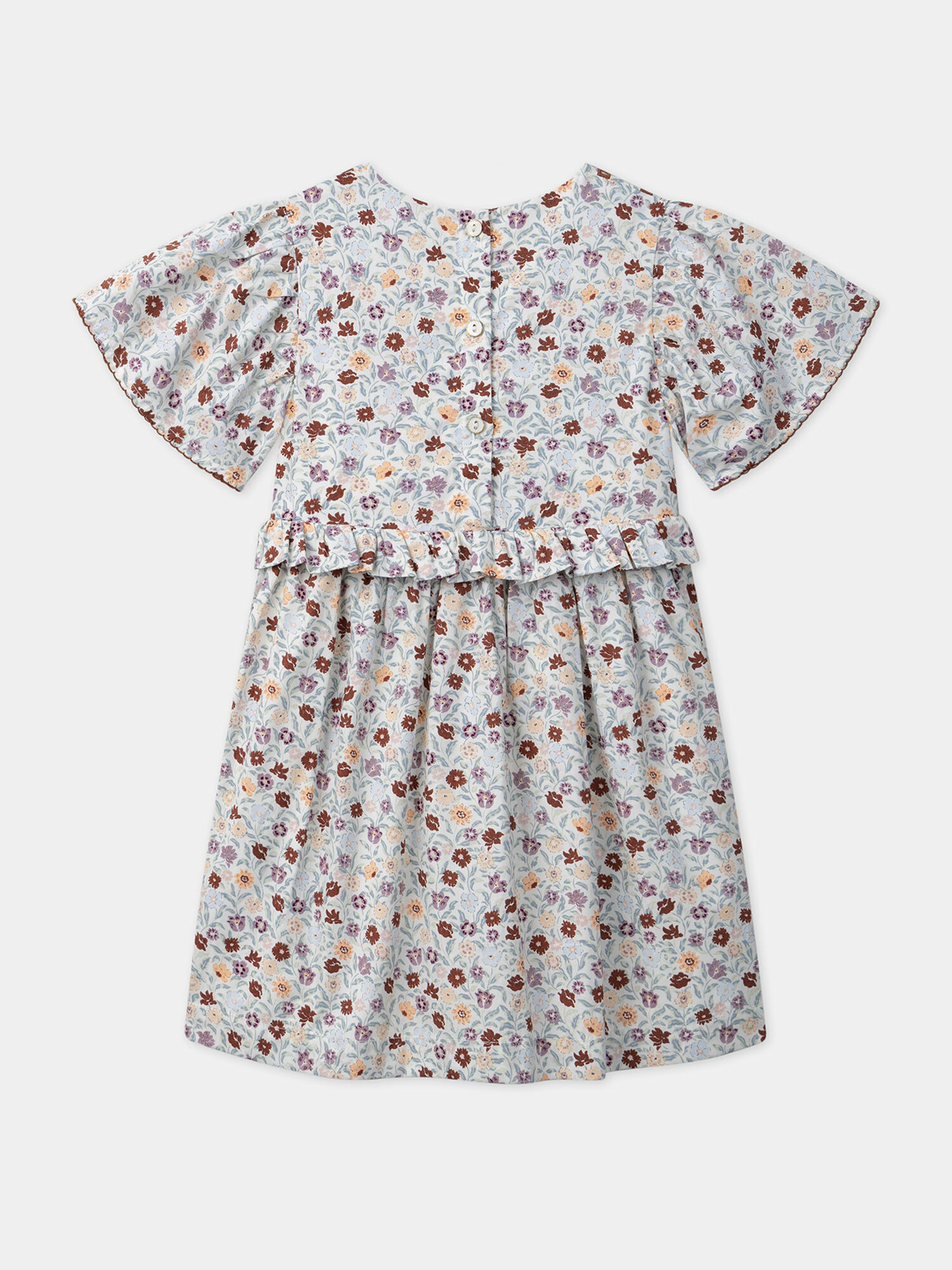 Robe en popeline à motifs floraux, croquet contrasté en bas de manches, volant au niveau de la poitrine, doublure en coton pour plus de douceur, ouverture par boutons dans le dos. Ce modèle fait partie de la collection Terre de Chardons.