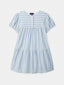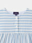 Fabriquée en coton doux, la robe présente des rayures bleues classiques et une coupe droite avec manches courtes. Elle se ferme facilement grâce à un bouton au dos, assurant un enfilage rapide et pratique.