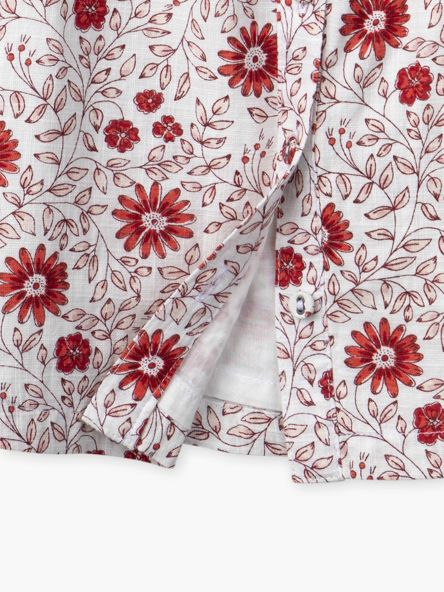 Imprimé floral rose clair et rouge sur fond écru, manches courtes ballon, smocks sur le buste, encolure élastiquée, doublure intégrée, ouverture dos intégrale avec boutons imprimés, bloomer assorti. Ce modèle fait partie de la collection Rouge de Garance.