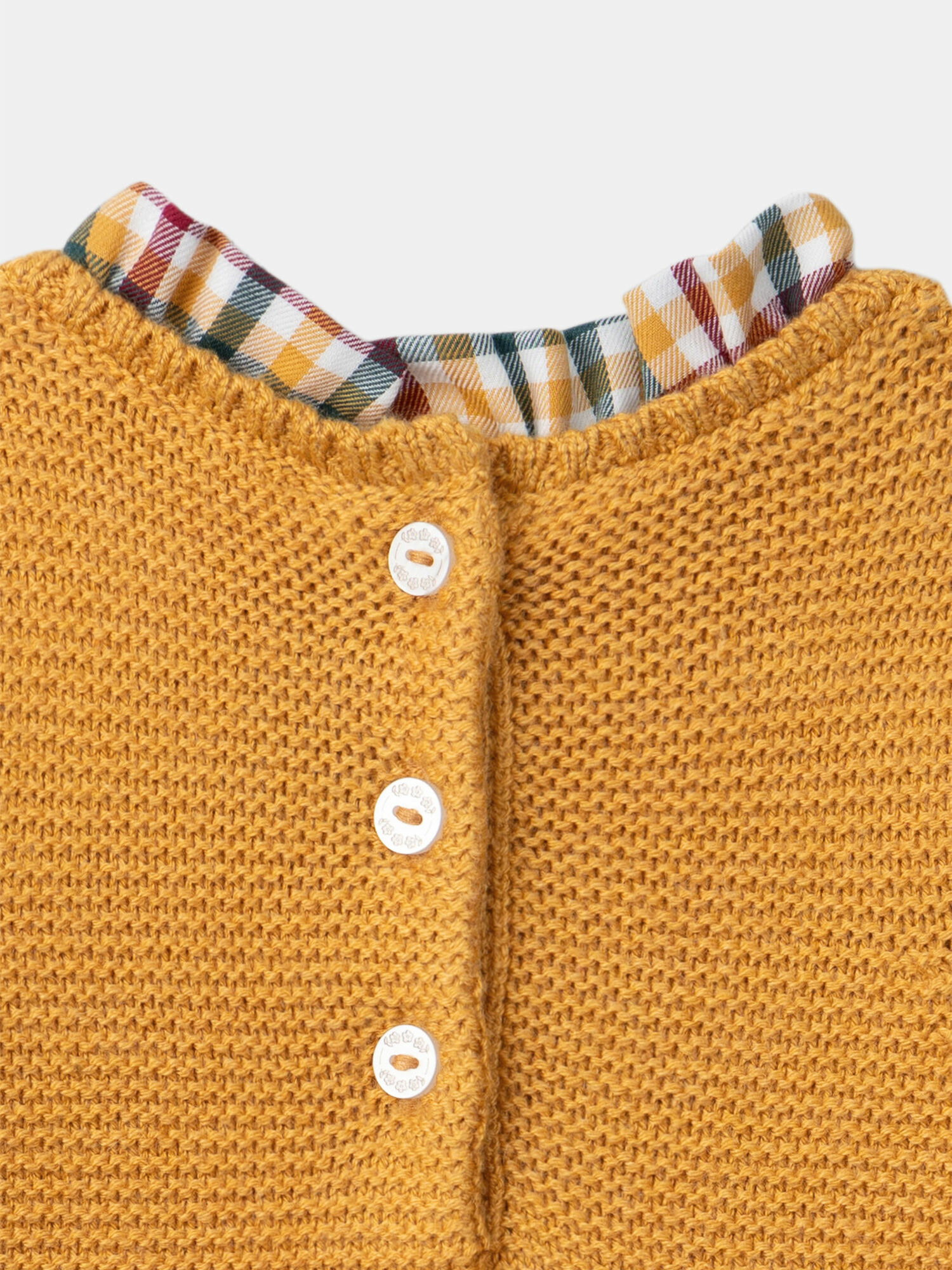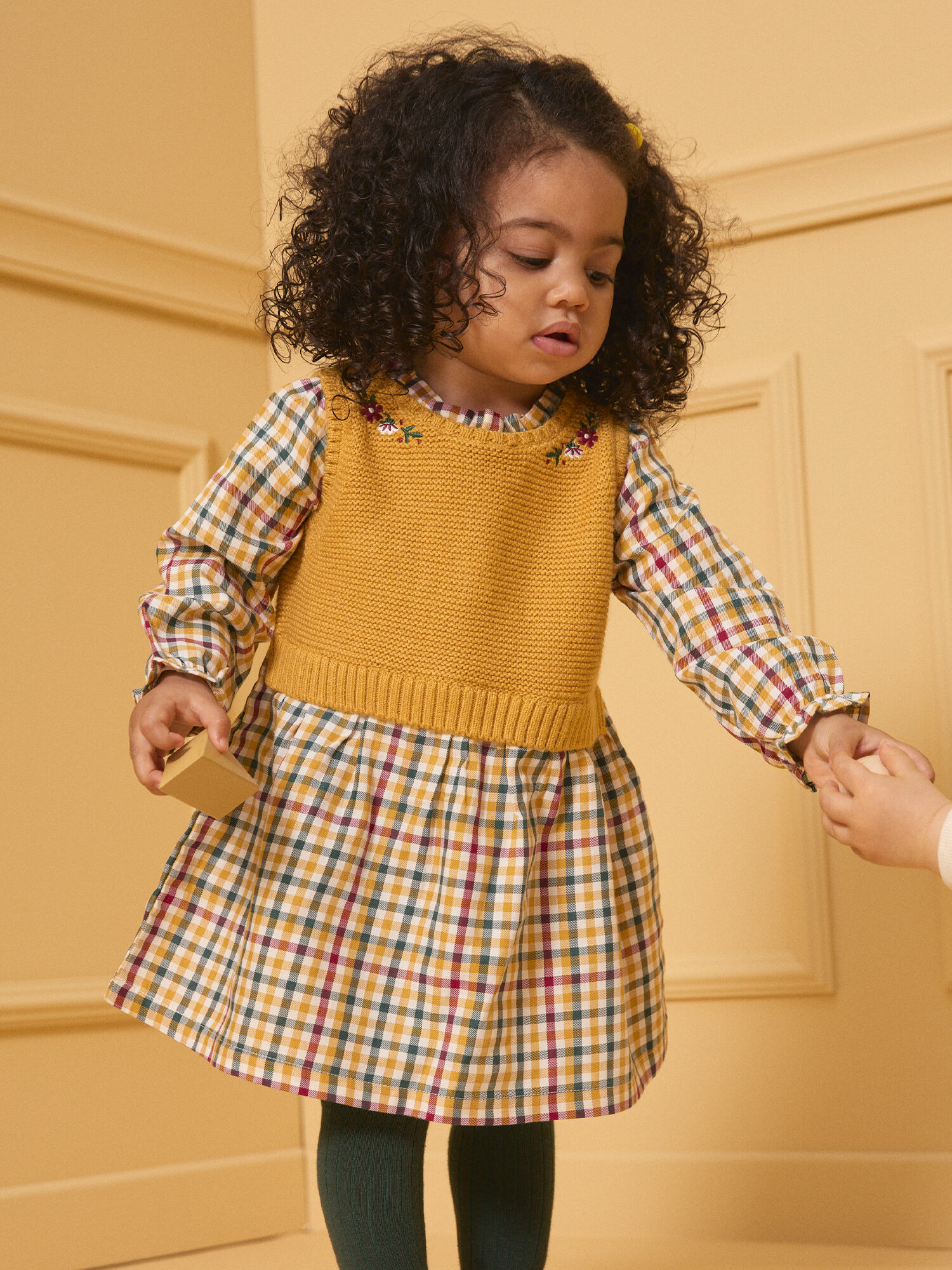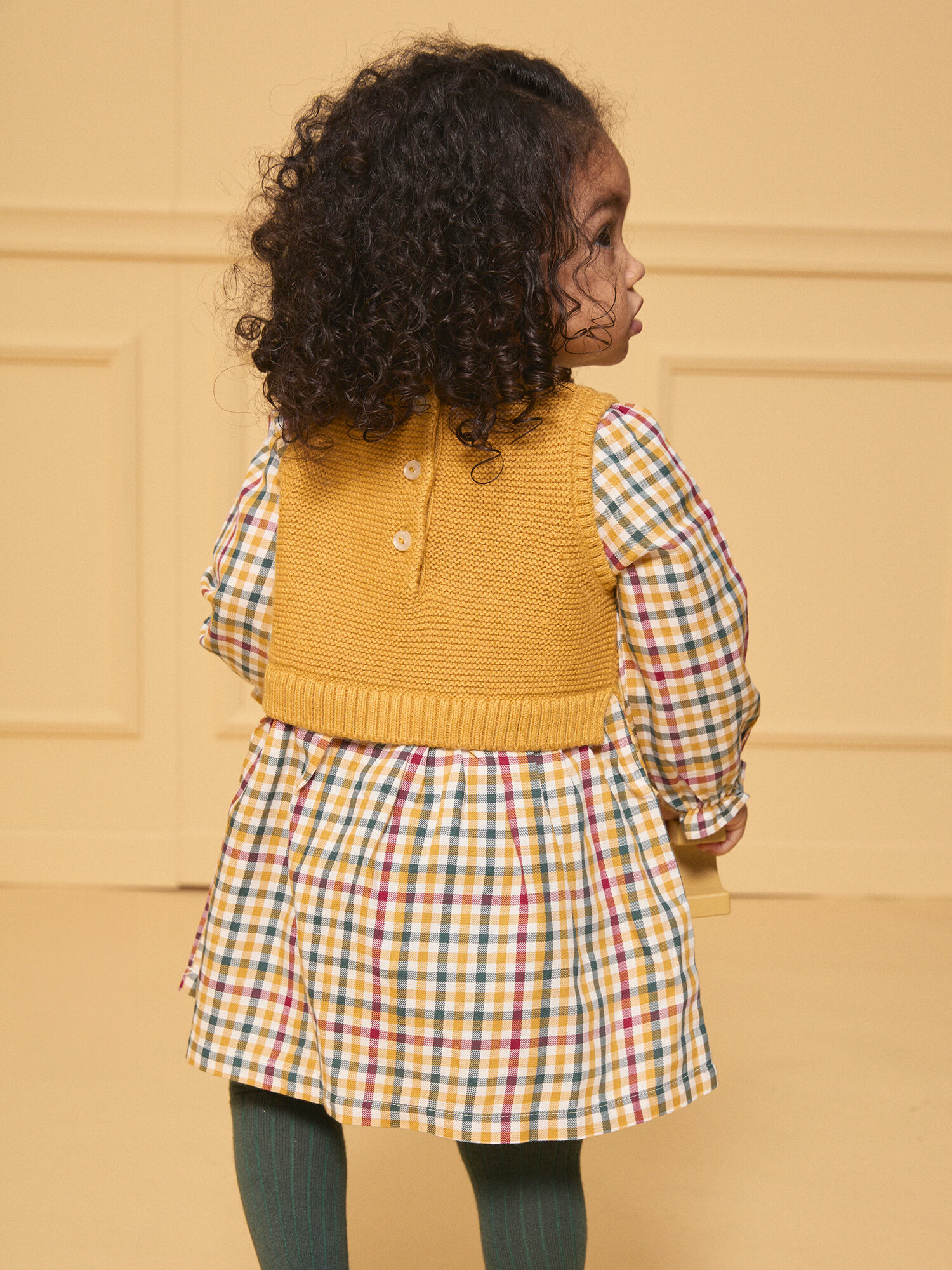 Le haut en tricot jaune miel, délicatement brodé de motifs verts sombres, bordeaux et écru, apporte une touche raffinée et chaleureuse. Le bas, les manches et le volant du col déploient un imprimé carreaux dans les mêmes teintes sur fond écru, créant un contraste harmonieux et dynamique. L’ouverture au dos, facilitée par des boutons, assure un enfilage pratique sans compromettre l’élégance.