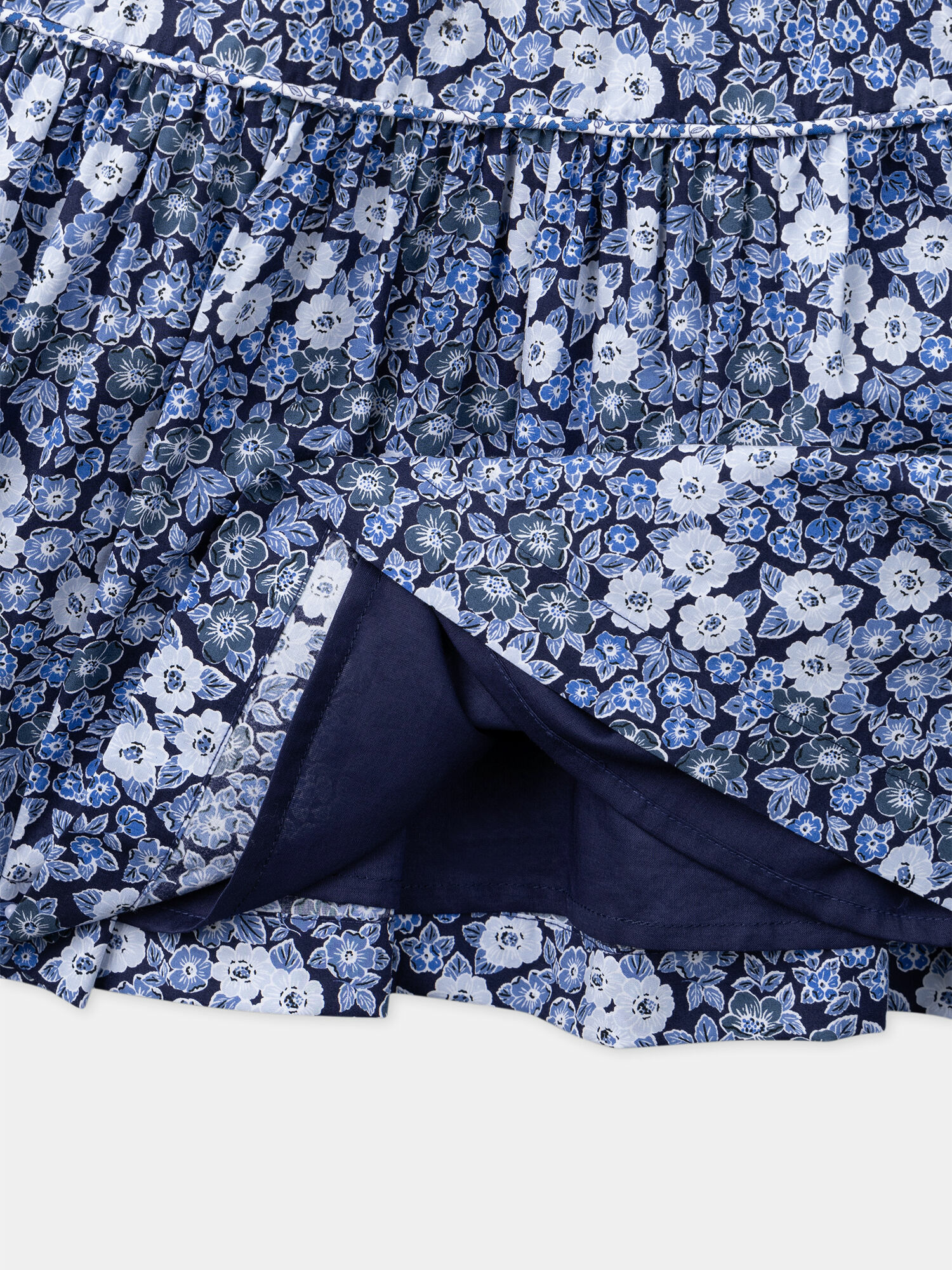 Robe à imprimé fleuri bleu marine, manches courtes nouées, encolure carrée, fronces sur le devant et au dos, ouverture à boutons au dos. Doublure en coton pour un confort optimal. Collection Pastel à Lisbonne, marque Sergent Major. Référence : LEROBETTE / 24H2PFJ1ROB070.