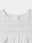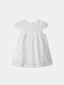 Cette robe est confectionnée dans un tissu respirant, avec une broderie florale en fil ton sur ton. Elle présente une coupe droite légèrement évasée, des manches courtes et une fermeture discrète au dos.