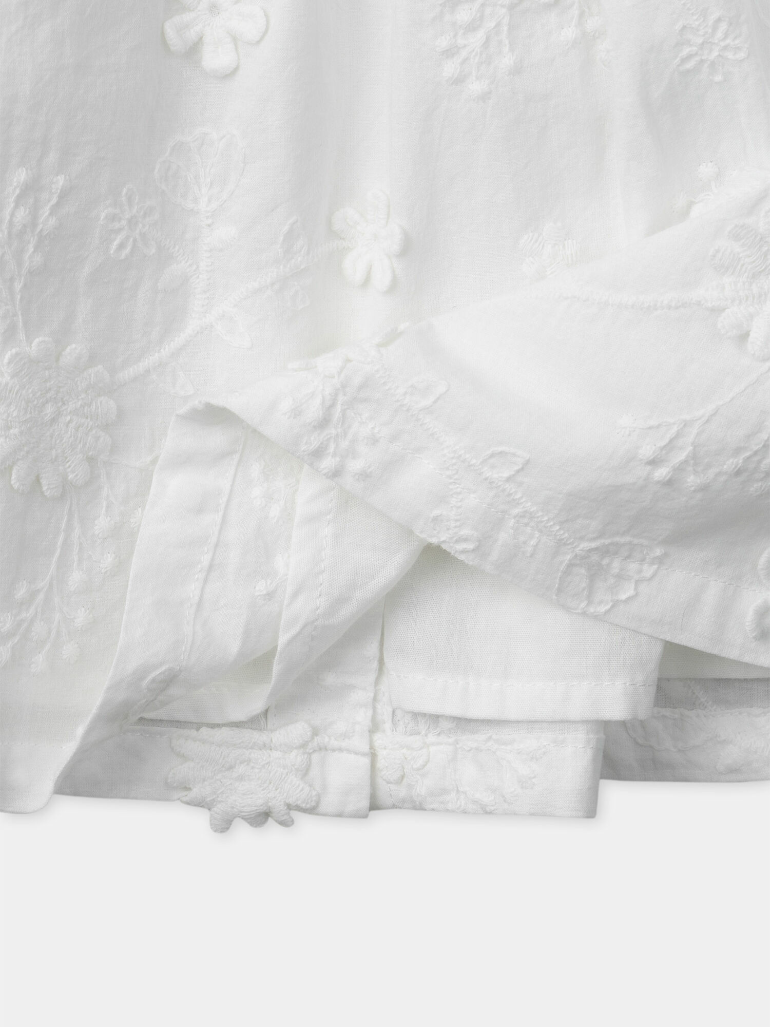 Cette robe légère séduit par ses smocks raffinés sur le buste et ses broderies florales ton sur ton en relief, qui apportent une dimension unique à la tenue. Doublée pour assurer douceur et aisance, elle offre une silhouette aérienne grâce à ses manches courtes. L’ouverture intégrale au dos, ornée de boutons en forme de fleurs, facilite l’habillage tout en ajoutant une touche de charme. Le bloomer assorti complète l’ensemble pour garantir liberté de mouvement et confort au quotidien.