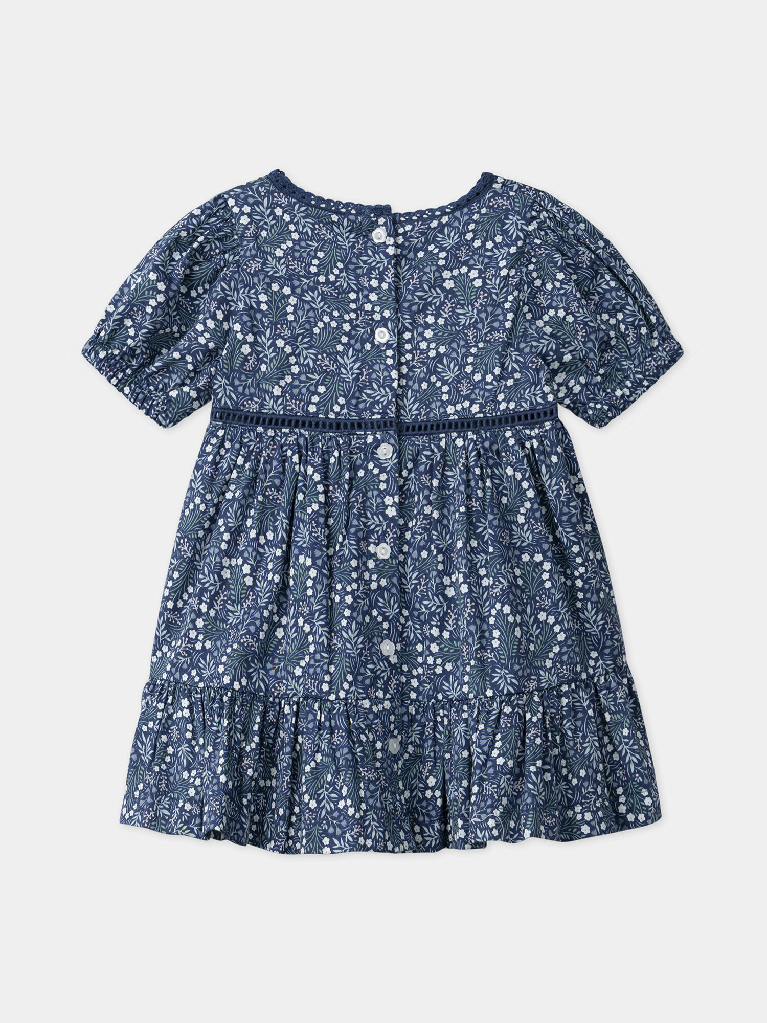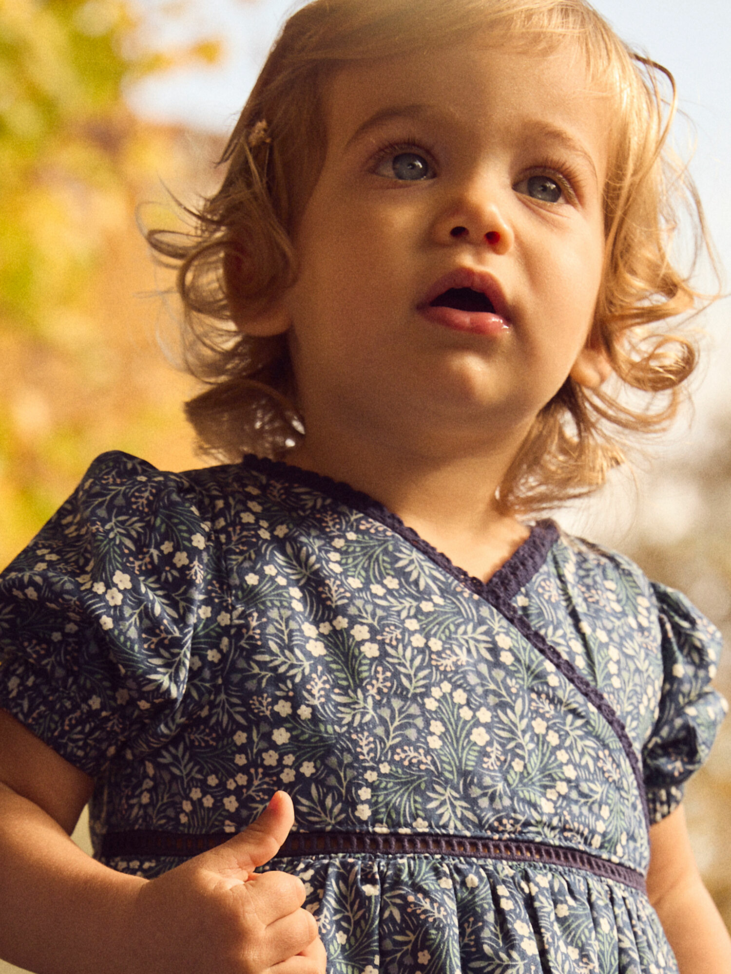 Imprimé fleuri écru, vert sauge et rose pâle sur fond bleu marine, manches courtes ballon, dentelle délicate sur l’encolure, ouverture dos intégrale avec boutons fleurs, bloomer assorti inclus. Ce modèle fait partie de la collection Ciel de Coton. Pour découvrir ses qualités environnementales, consultez la fiche produit dédiée.