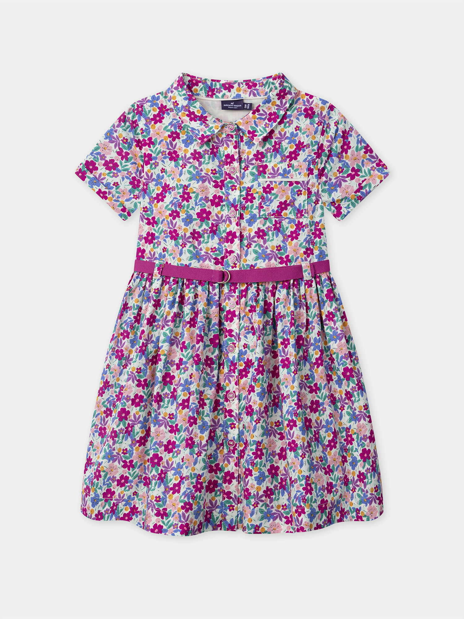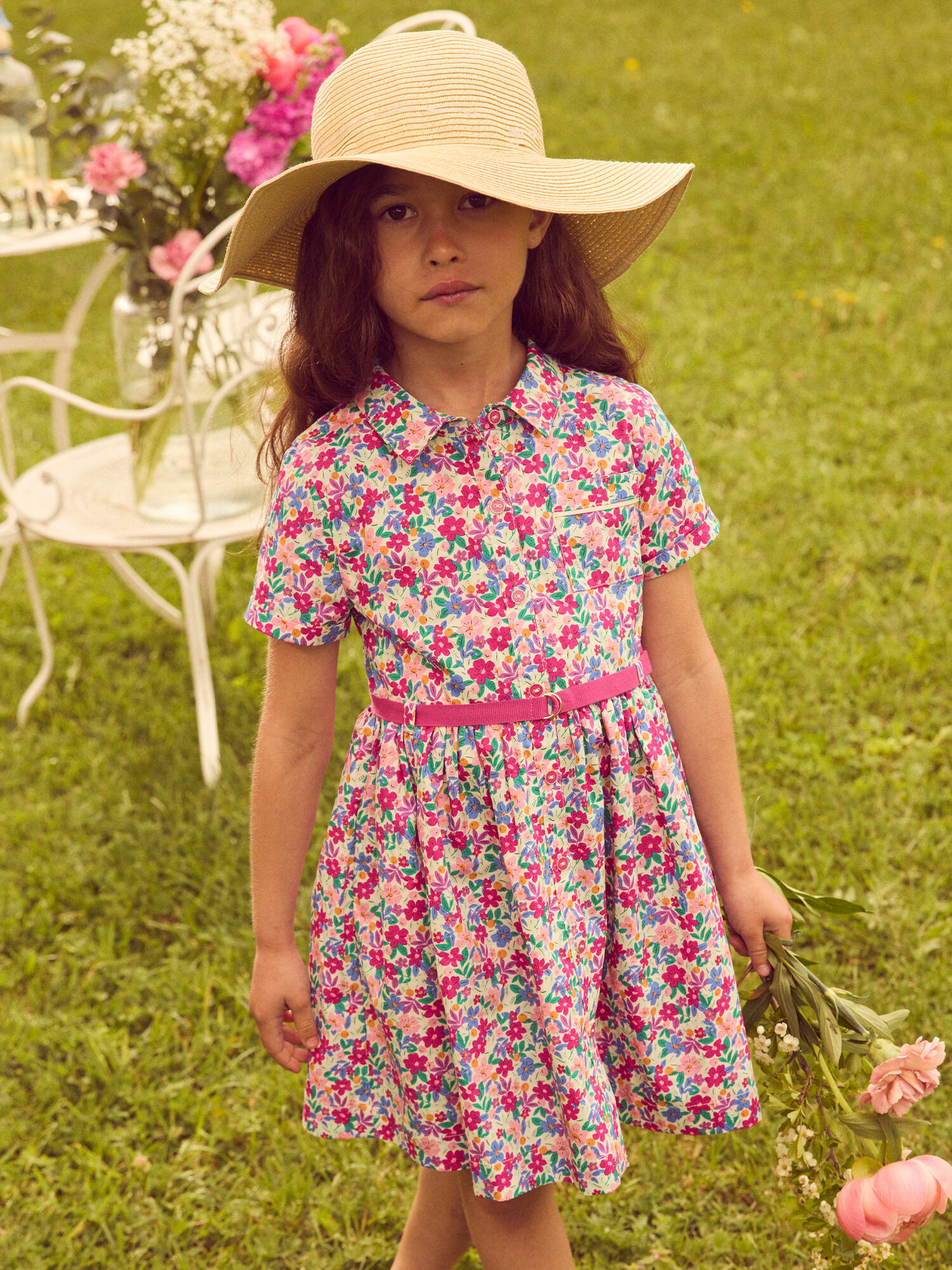 Cette robe chemise à fleurs séduit par ses détails soignés : volants délicats à la taille qui soulignent la silhouette, ouverture boutonnée pratique sur le devant, et deux poches poitrine pour un look à la fois chic et fonctionnel. La ceinture amovible permet d’ajuster parfaitement la robe, offrant une coupe personnalisée qui accompagne les mouvements de votre enfant en toute liberté.