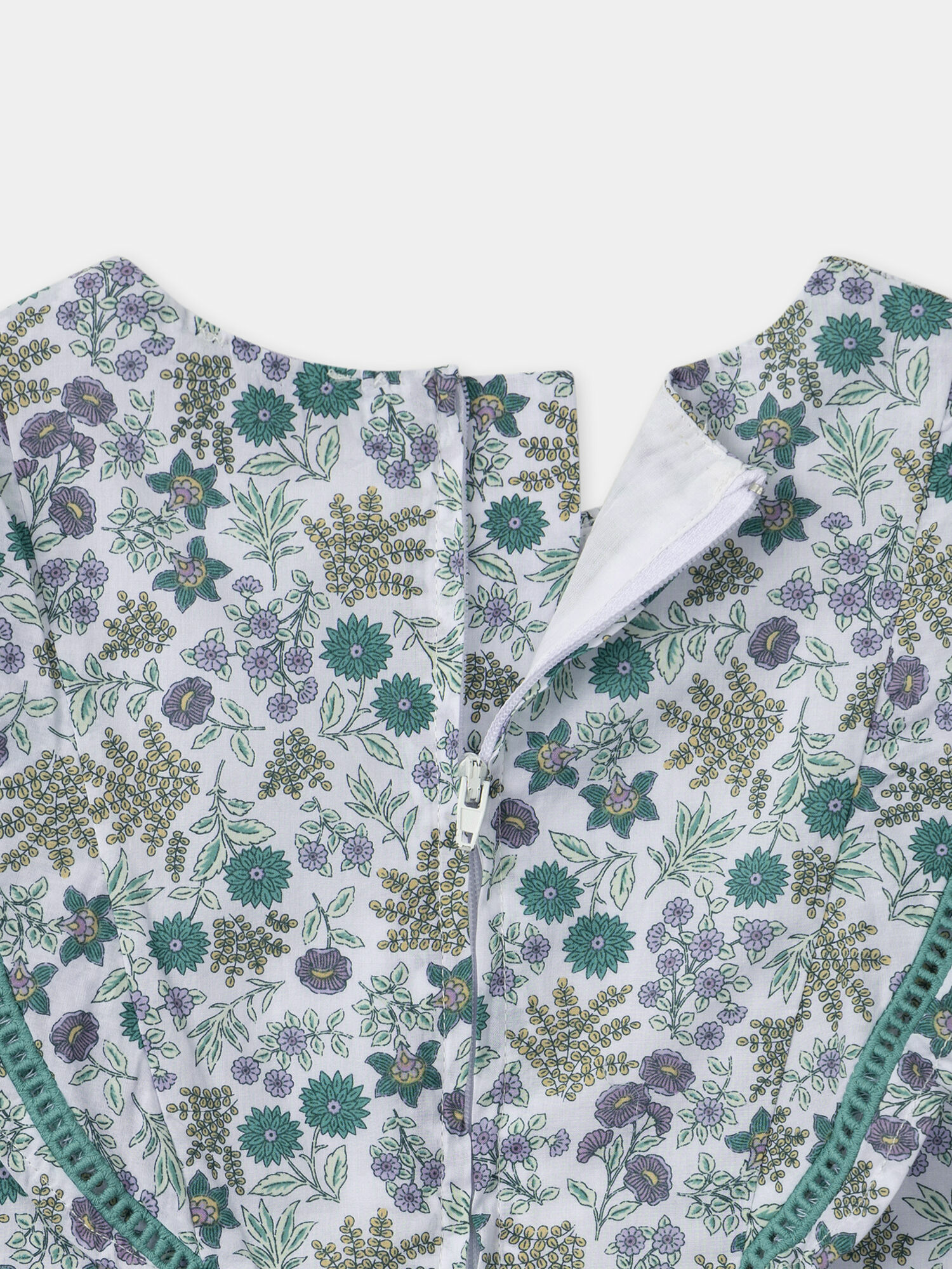 Smock à la poitrine, volants et points échelles aux épaules, doublure en coton pour un toucher doux, ouverture zippée dans le dos pour un enfilage rapide. Ce modèle fait partie de la collection Vert de Tilleuil, reconnue pour son engagement qualité.