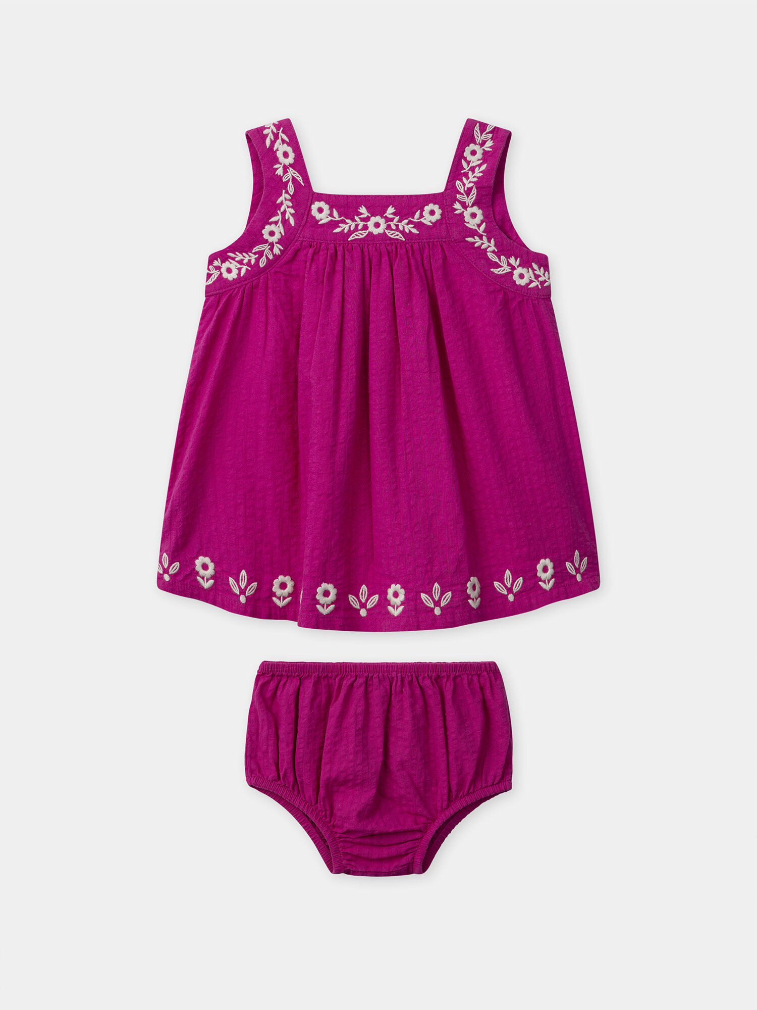 Robe fuchsia sans manches, brodée de fleurs écrues sur l’encolure et le bas. Doublure intégrale au dos. Ouverture dos combinant boutons classiques et pressions dissimulées. Du 18 mois au 36 mois, l’ouverture se fait uniquement par 3 boutons classiques. Ensemble composé de la robe et du bloomer assorti. Collection Goûter au Jardin.