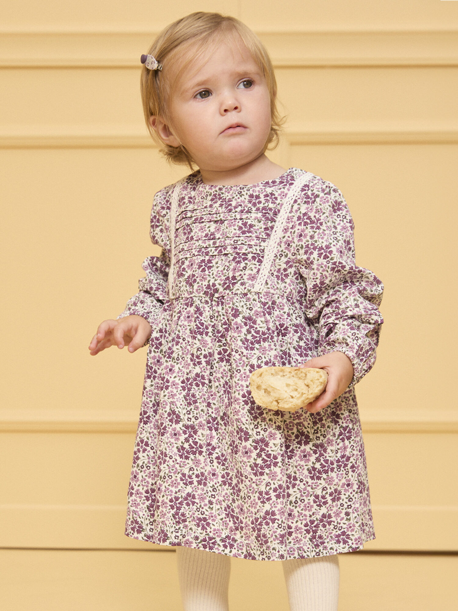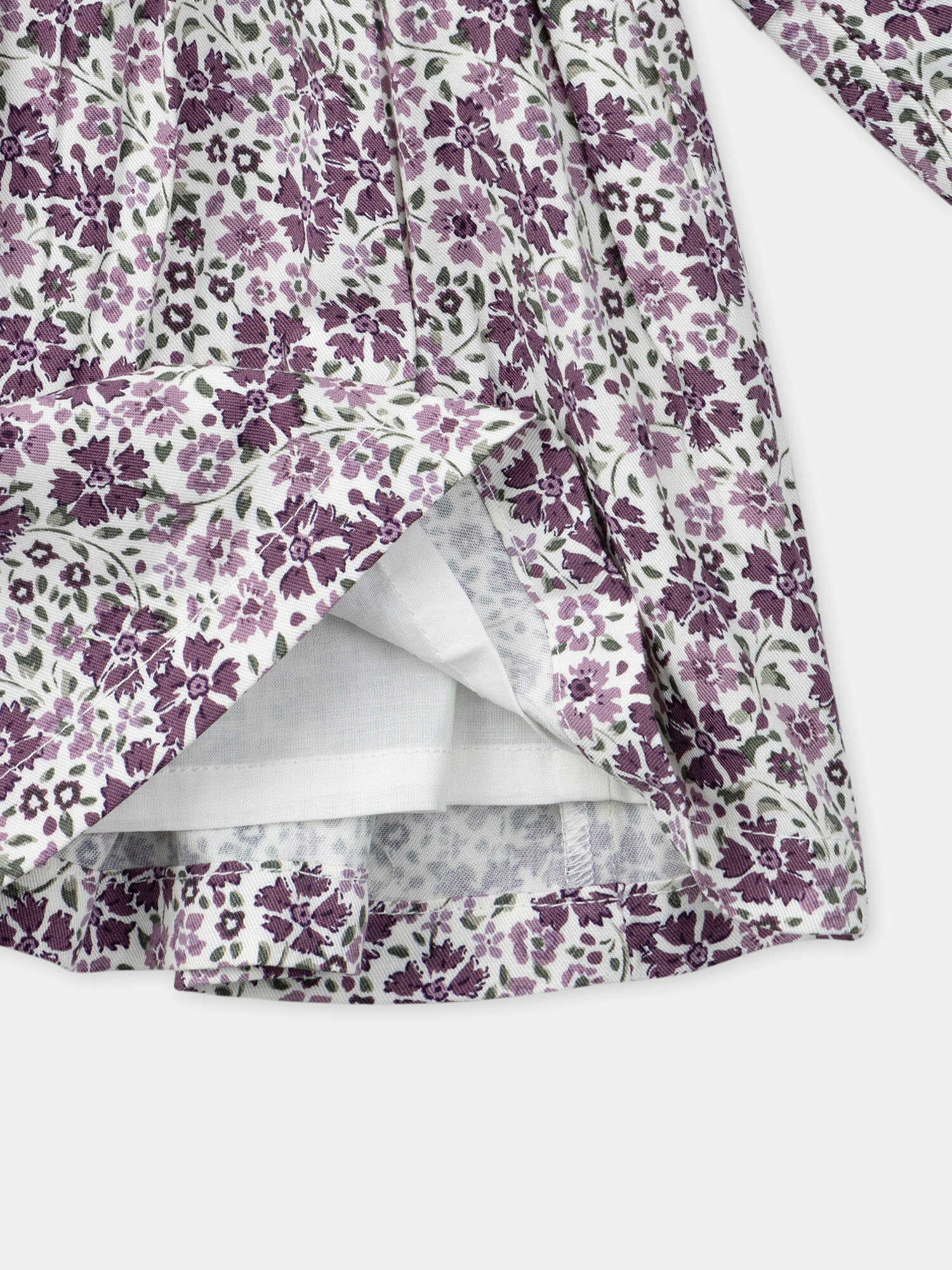 Imprimé fleuri violet foncé, parme et vert sur fond écru. Manches amples avec plissage. Détails en dentelle sur le buste avec plissage. Doublure en toile de coton. Ouverture intégrale dans le dos par boutons en bois. Collection Chouquette à Paris, taille 5 ans. Référence : LAJANE / 24H1BFM1ROB001.