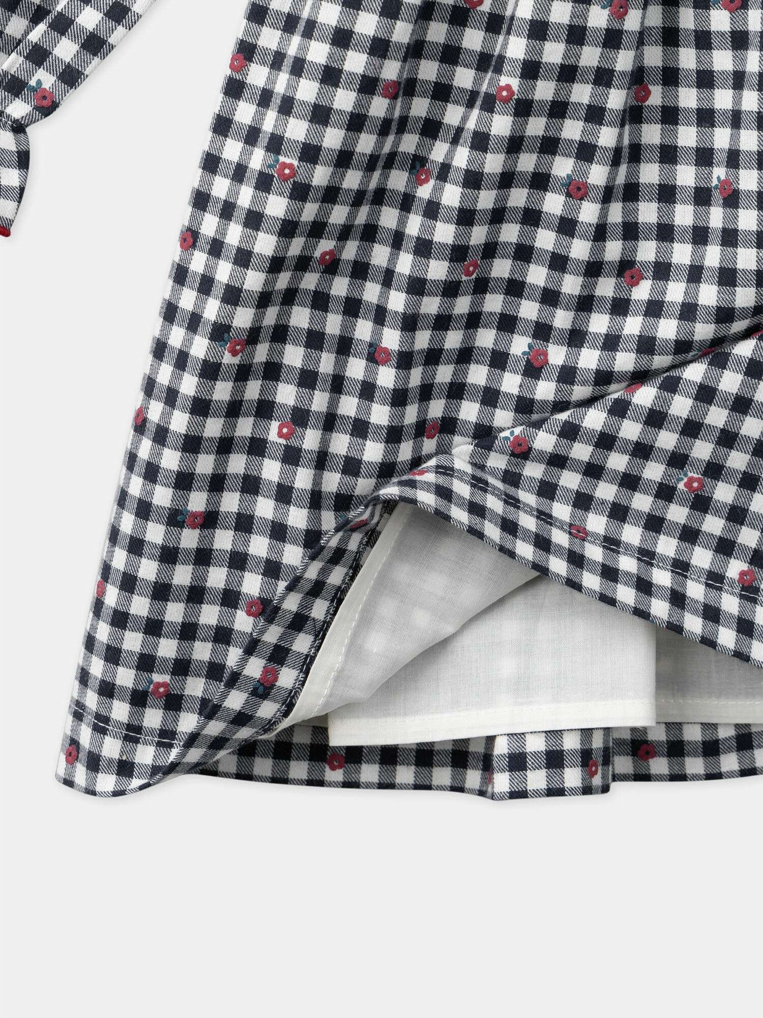 Motifs fleurs sur fond vichy, volant à l'encolure, bas de manches élastiqués, fronces à la taille et aux emmanchures, finition en point de bourdons rouge au bas des manches et à l'encolure, doublure en coton. Collection Pomme d'amour à Oslo. Référence : LOKARETTE / 24H2PFL2ROB001.