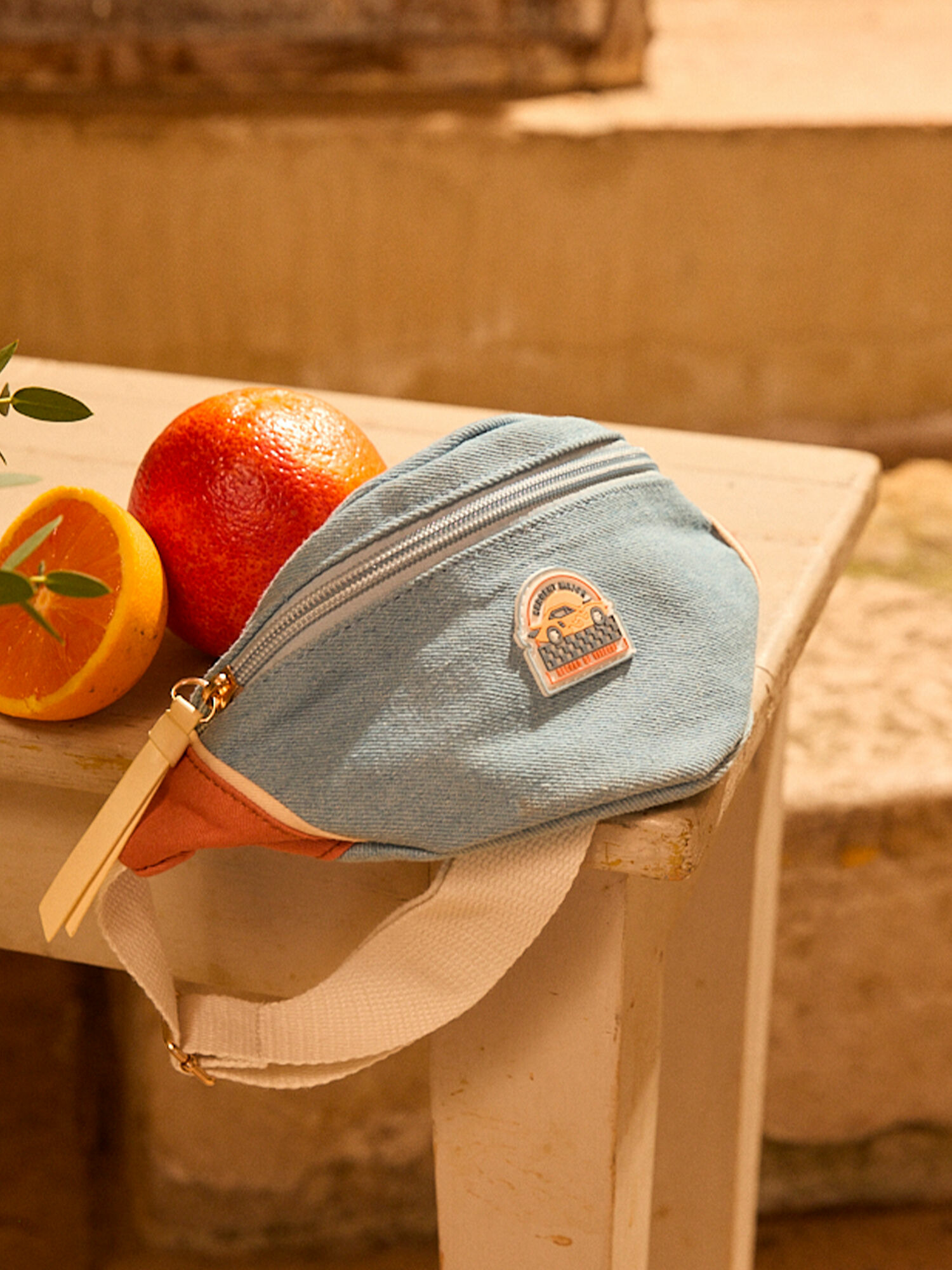 Dimensions 11 cm x 14 cm. Denim clair avec empiècements orange. Patch rubber "sergent major" et voiture. Fermeture zippée à l’avant. Lanière réglable écrue avec boucle dorée. Ce produit fait partie de la collection Ecorce D’orange.