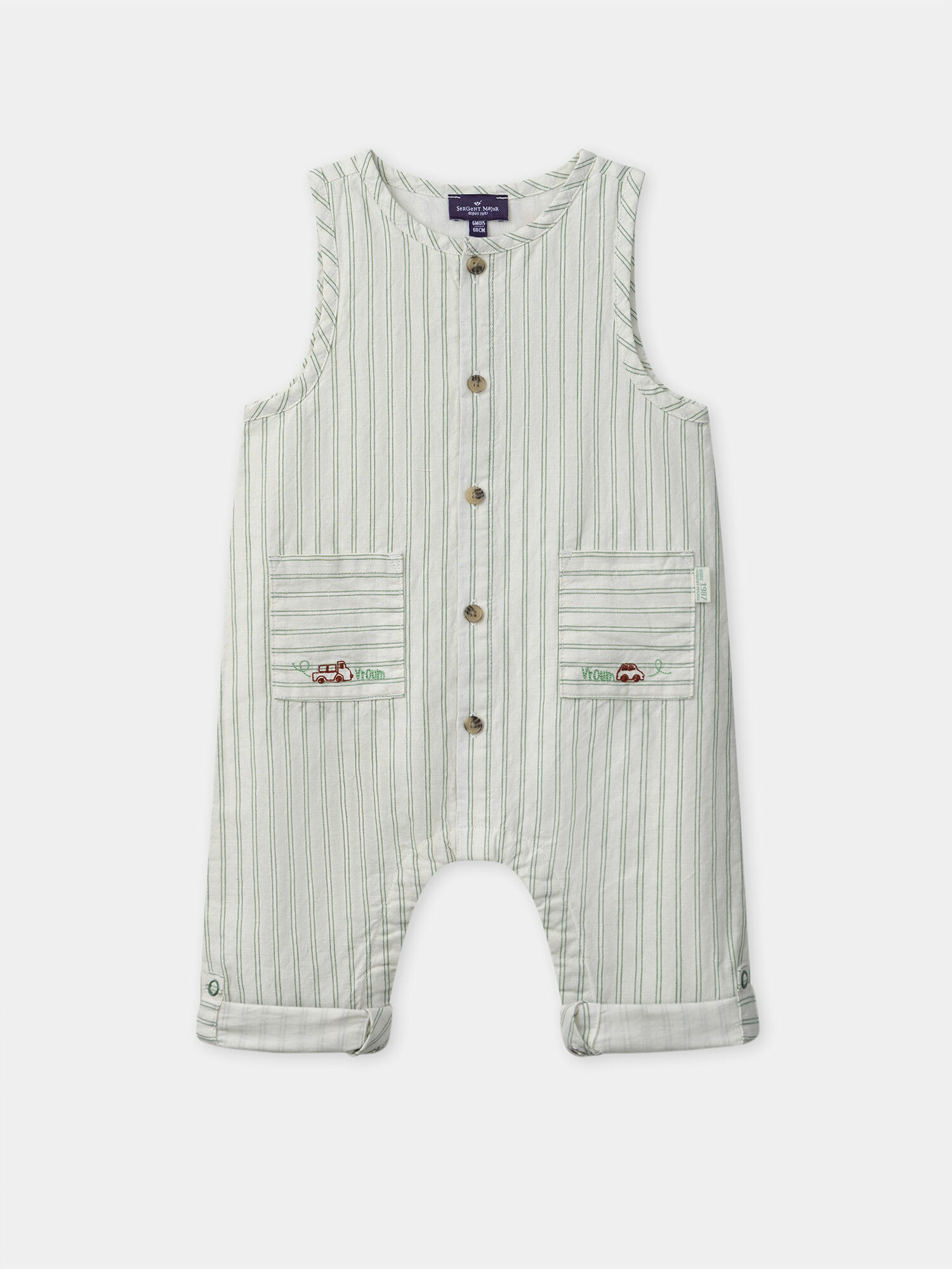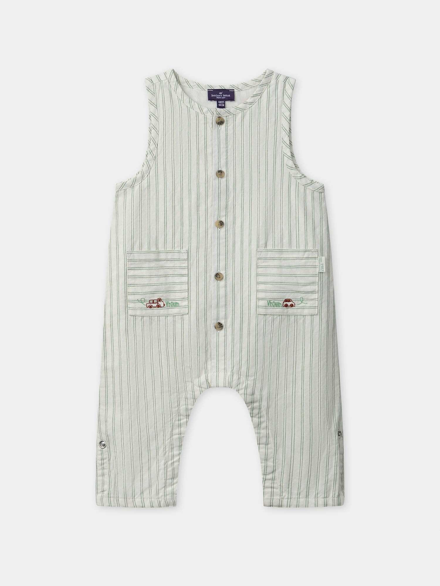 Rayures écrues et vertes, combinaison sans manches. Ouverture avant intégrale par boutons. Ouverture entrejambe par boutons à pression (du 3 au 18 mois). Deux poches plaquées avec broderies voitures et vignette tissée "Baby 1987 SERGENT MAJOR". Jambes retroussables par bouton à pression. Produit issu de la collection Goûter au Jardin.
