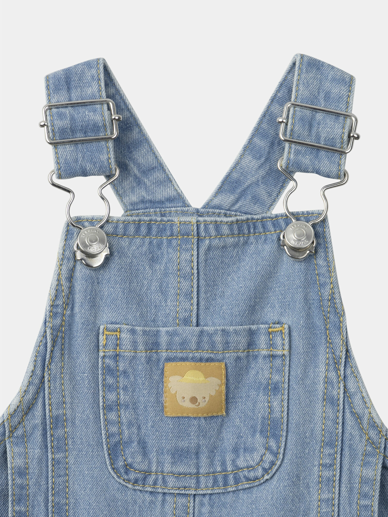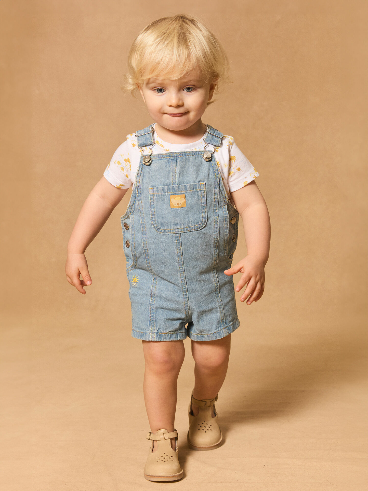 Poche poitrine avec vignette koala, deux poches avant avec broderie soleil, coutures contrastées jaune safran. Bretelles ajustables. Ouverture taille et entrejambe par boutons pression (entrejambe uniquement de 3 à 12 mois). Collection Jaune de Tournesol. Référence : MAMAURICE / 25E1BGK2SALP272.