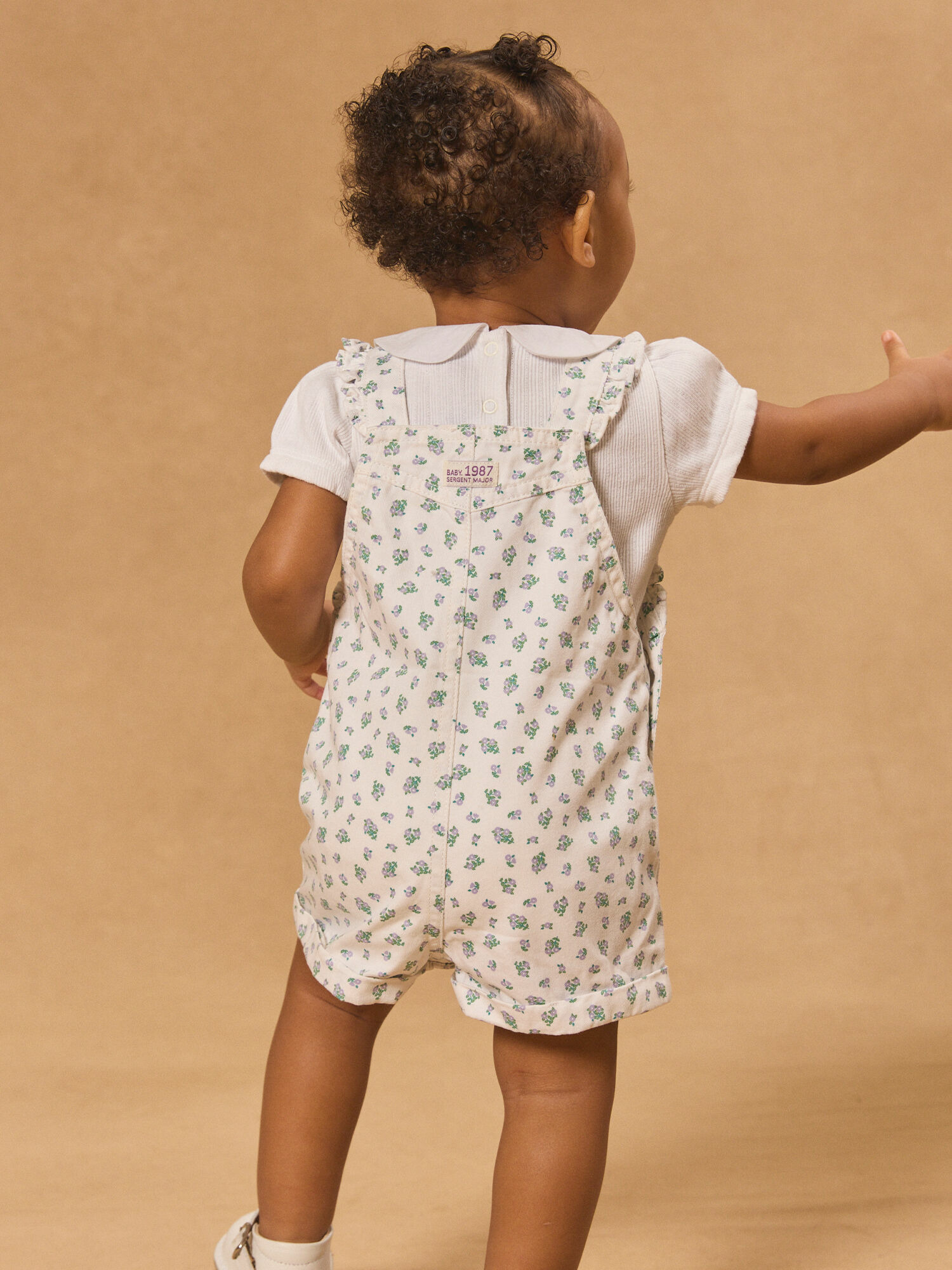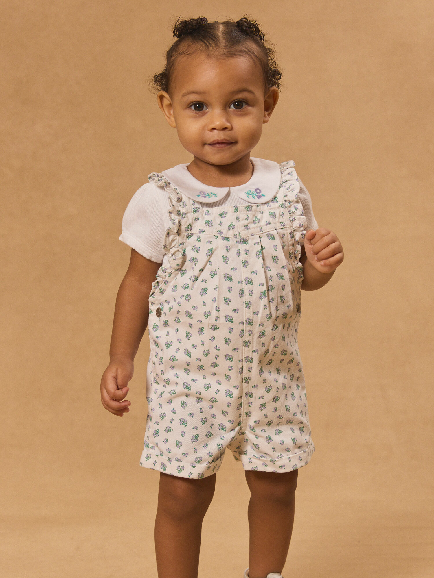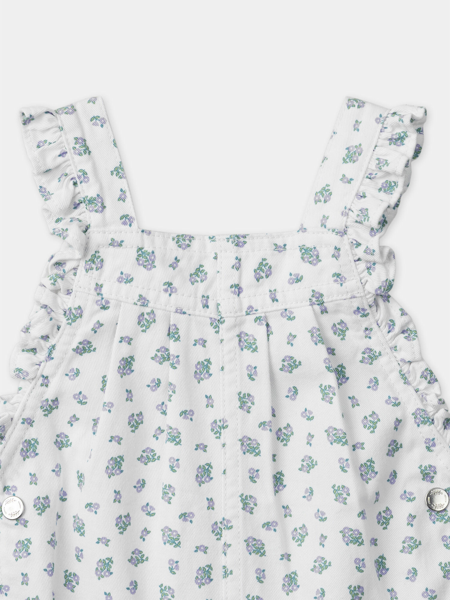 Imprimé fleuri mauve et vert sur fond écru. Ourlets fixes sur les cuisses. Volants latéraux sur bretelles et buste. Ouverture entrejambe et taille par boutons à pression. Bretelles ajustables. Collection Vert de Tilleuil. Référence : MAPERRINE / 25E1BFO1SAL001.