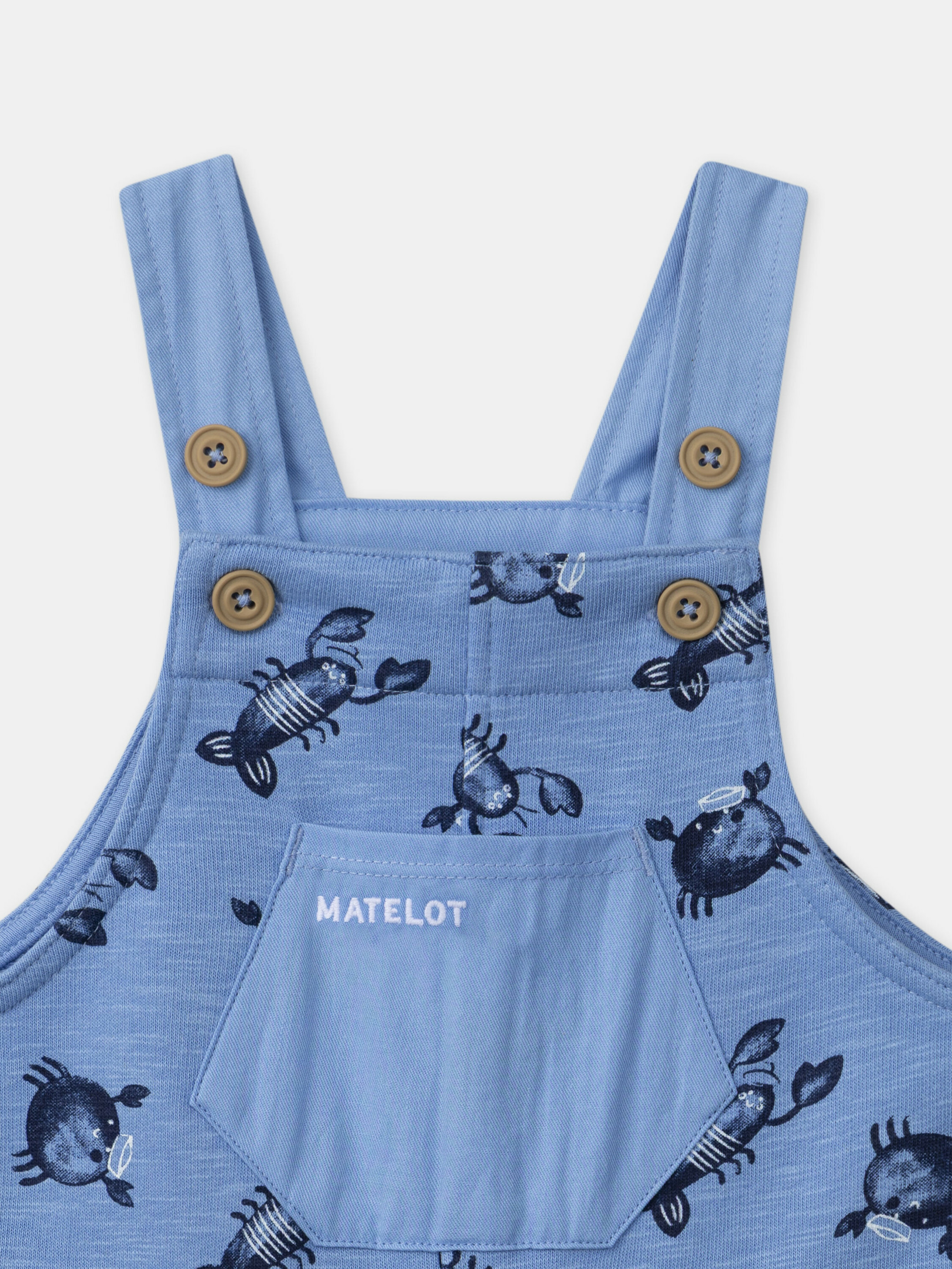 Question ? Quels sont les motifs de cette salopette ? Réponse. Elle est imprimée de homards et crabes bleu marine, avec des poches contrastées bleu cyan.