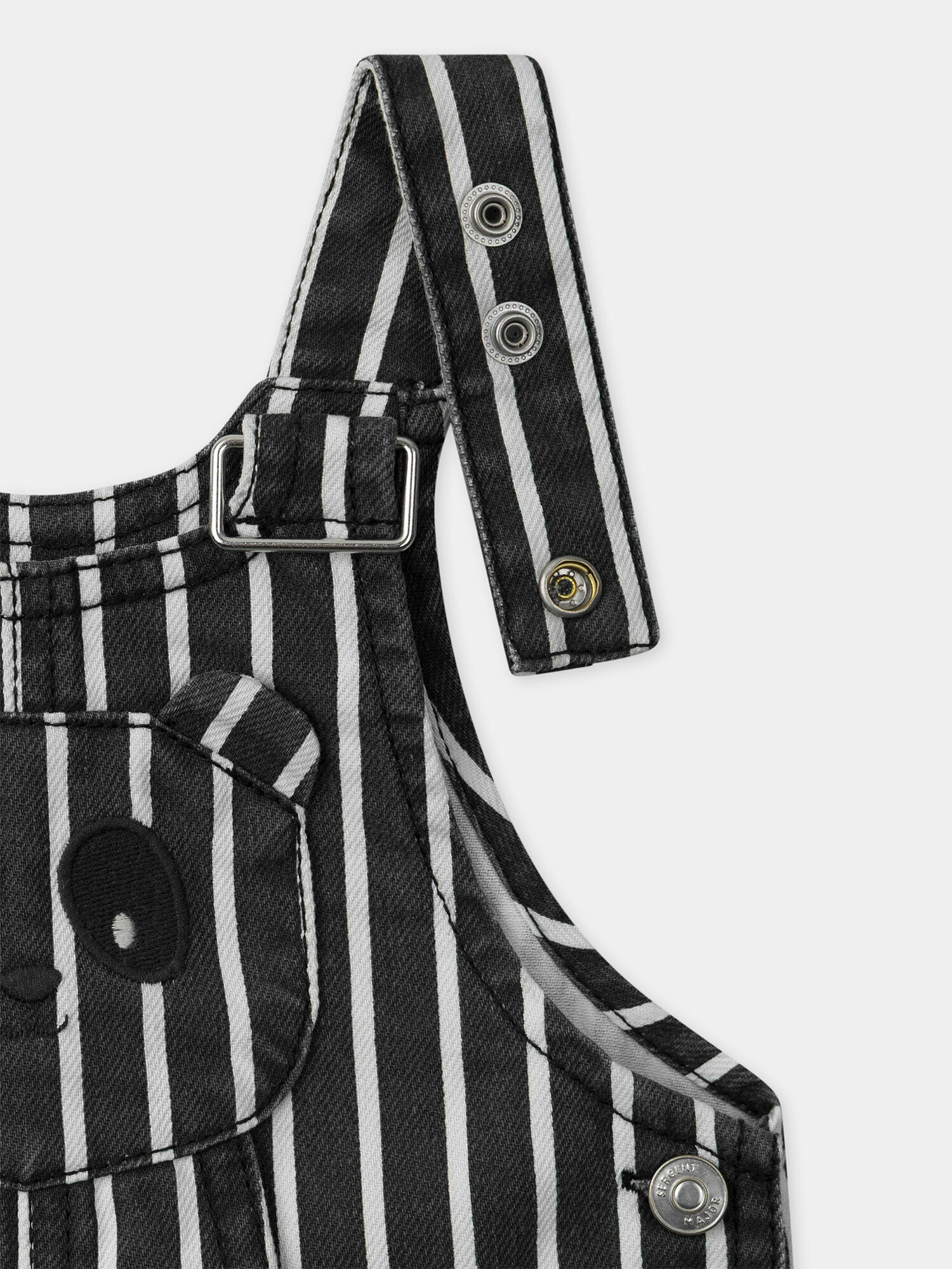 Patch visage de panda avec oreilles 3D sur le buste, 2 poches avant, poche arrière brodée "Pand'amour", vignette tissée "Baby 1987 Sergent Major". Ouverture entrejambe par boutons à pression (du 3M au 12M), ouverture taille par boutons classiques, bretelles ajustables. Disponible dans la collection Sable Noir.