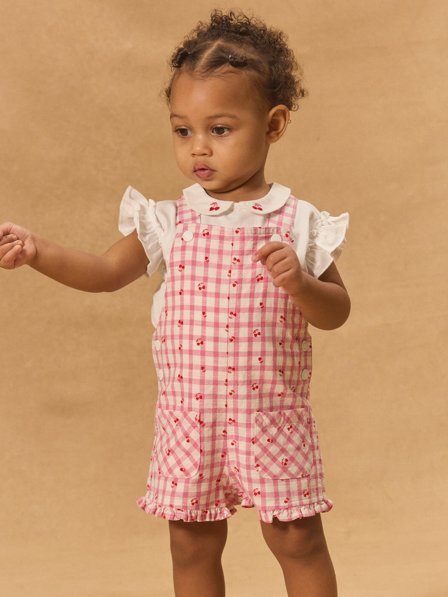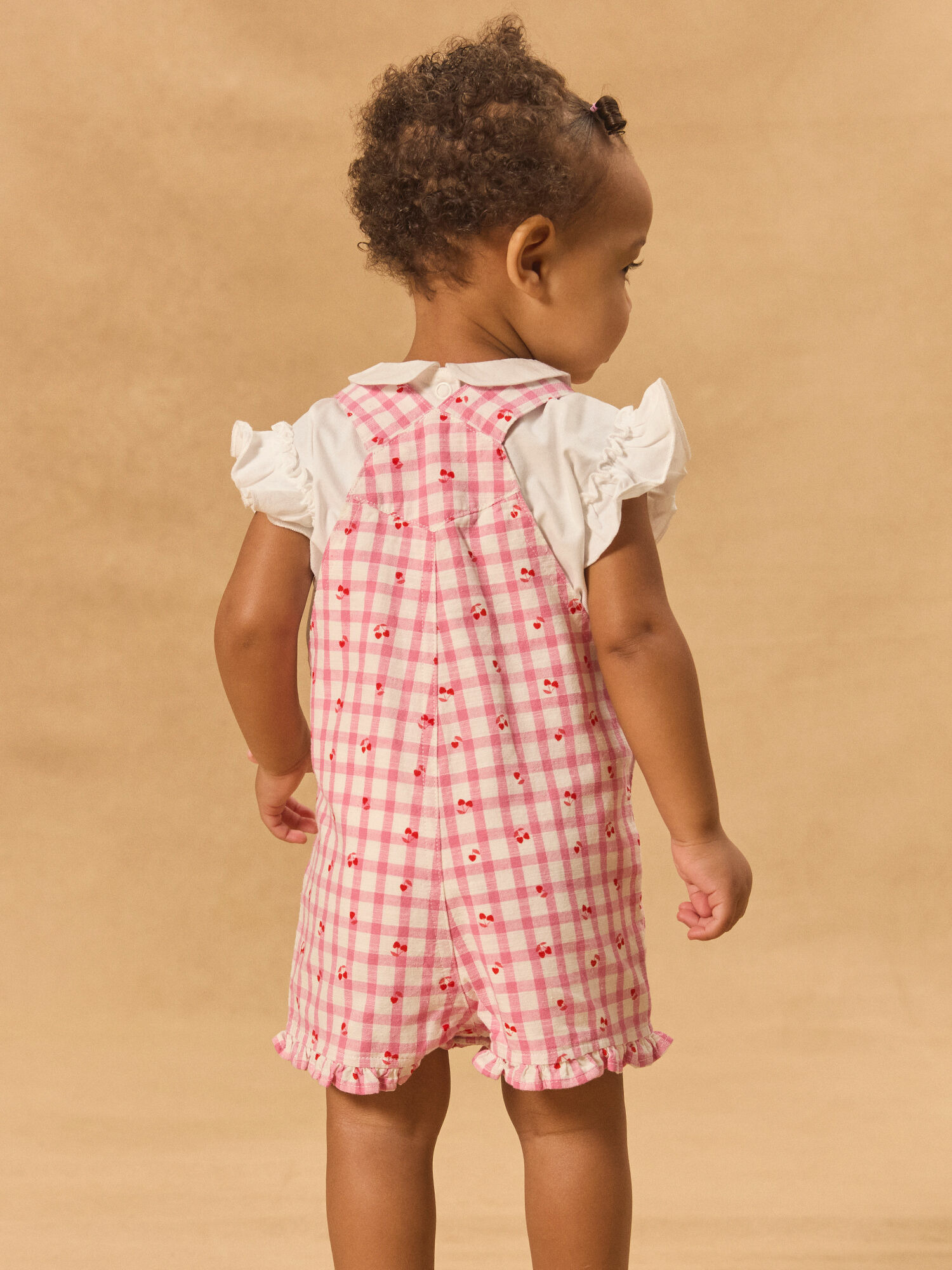 Légère et pleine de charme, cette salopette courte vichy rose aux imprimés cœurs et cerises rouges est un incontournable pour les petites rêveuses. Son design frais et délicat invite à profiter des beaux jours avec style et confort.