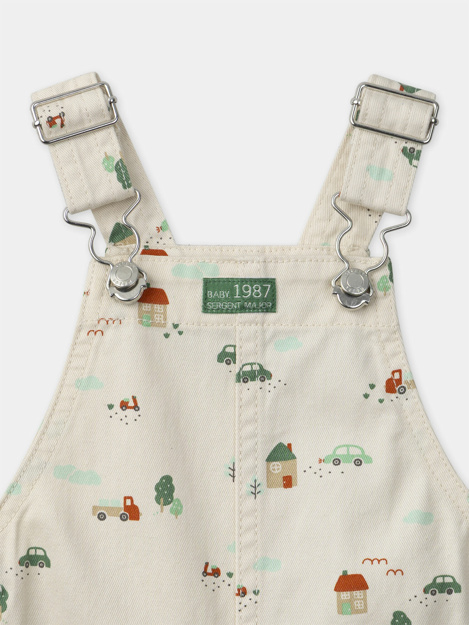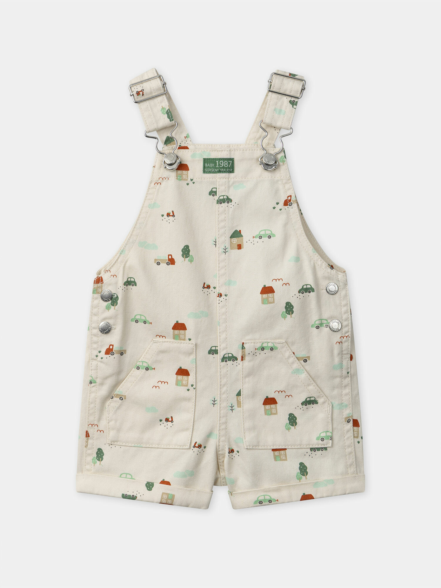 Salopette courte écrue imprimée de voitures et maisons en beige, vert et tomette. Vignette avant "Baby 1987 SERGENT MAJOR". Deux poches plaquées sur le devant, une poche arrière. Ourlets fixes. Bretelles ajustables. Ouverture à la taille par boutons à pression. Ouverture entrejambe par boutons à pression du 3M au 18M. Collection Goûter au Jardin.
