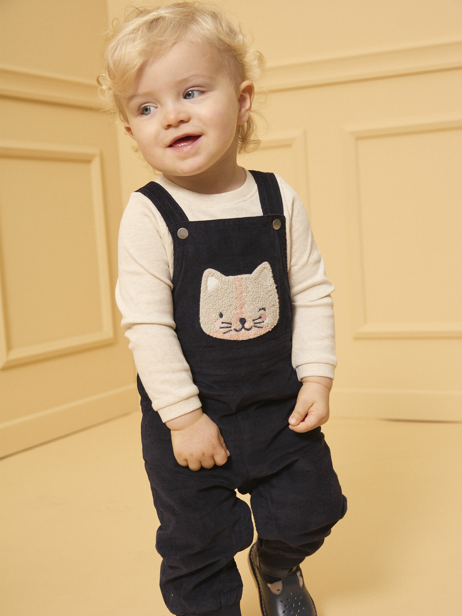 Offrez à votre petite fille une touche d’originalité et de douceur avec cette salopette longue en velours côtelé. Son patch chat en bouclettes aux tons beige, bleu marine et écru apporte un charme unique à un vêtement pratique et confortable.