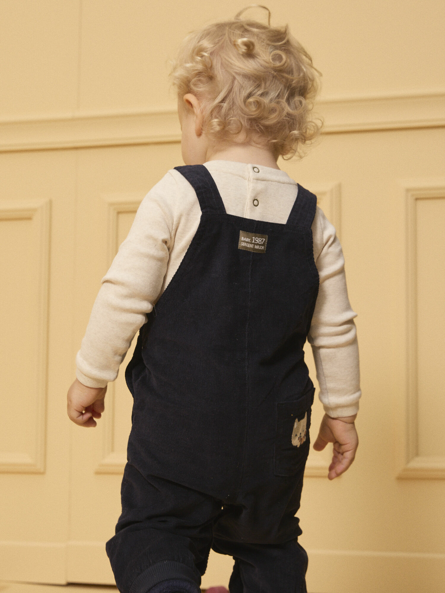 Conçue pour allier style et fonctionnalité, cette salopette se distingue par ses détails soignés : deux poches avant et une poche arrière ornée d’un patch chat brodé avec un croissant aux nuances naturelles. Les vignettes tissées "Baby 1987 Sergent Major" en kaki ajoutent une signature discrète et élégante, parfaite pour compléter une tenue casual ou plus habillée.