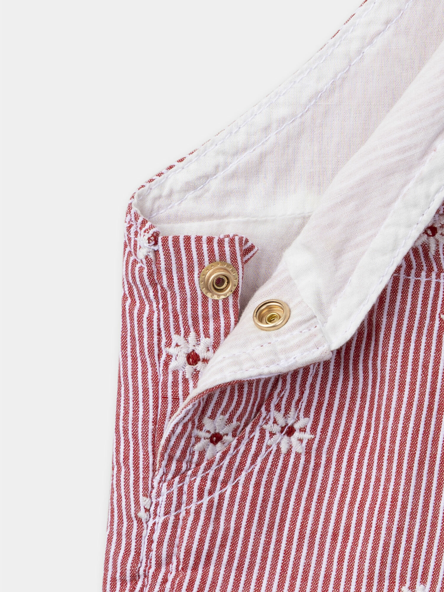 Rayures classiques, broderies fleurs délicates, poche plaquée avec vignette "Baby 1987 Sergent Major", 2 poches avant et arrière, bretelles ajustables, ouverture par boutons pression à la taille et à l’entrejambe, ourlets fixes. Ce modèle fait partie de la collection Rouge de Garance.