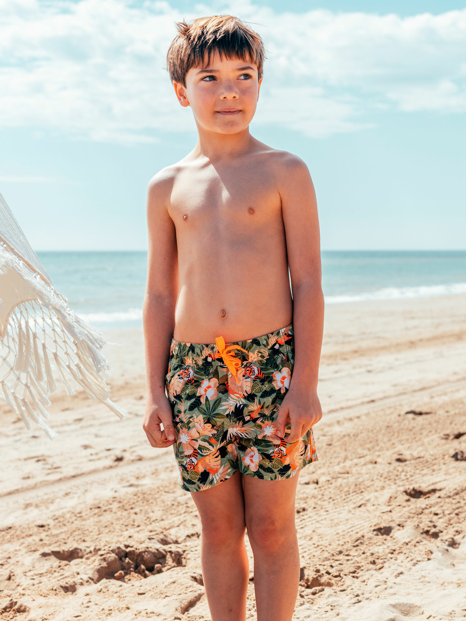 Profitez d’un ajustement personnalisé grâce au cordon de serrage orange néon, qui ajoute une note moderne et pratique. La taille élastiquée facilite l’enfilage et assure un maintien sans contrainte, pour que vos enfants restent à l’aise toute la journée, que ce soit à la piscine ou à la mer.