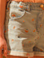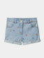 Short en denim 100% coton, imprimé fleurs, taille ajustable par élastique intérieur, fermeture à bouton et zip, deux poches avant et deux poches arrière.