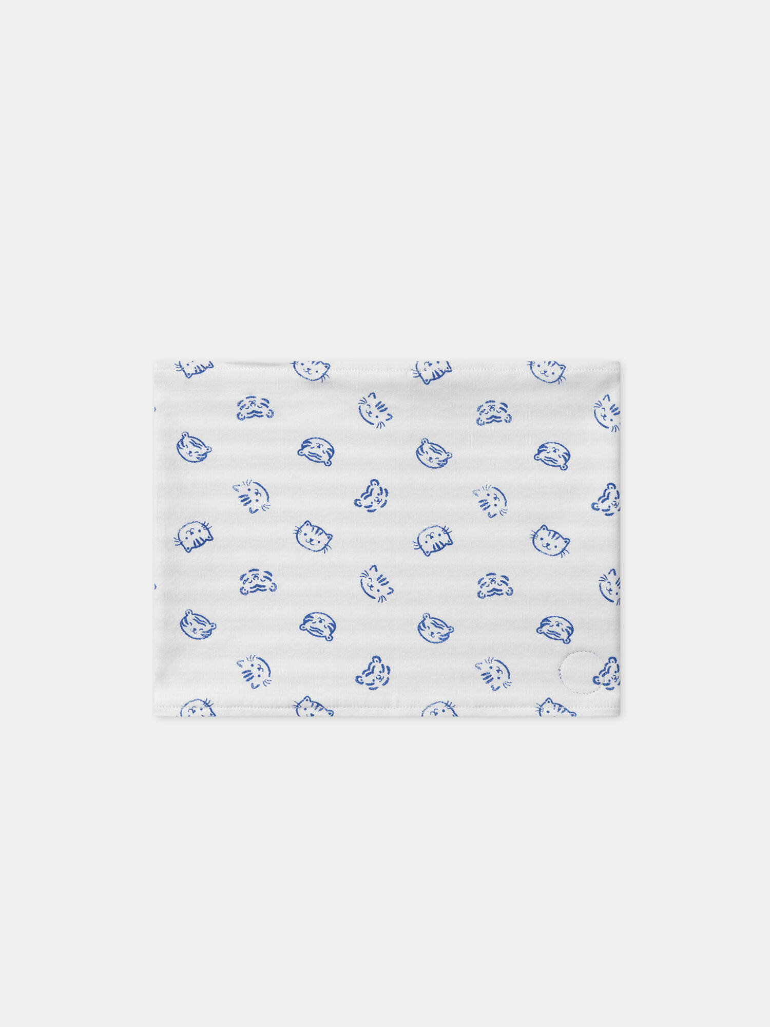 Confectionné en jersey souple, ce snood propose une face imprimée d’une tête de chat sur fond écru, pleine de charme et de malice, tandis que l’autre affiche un motif rayé bleu ciel, plus classique et apaisant. Facile à enfiler, il enveloppe le cou des petits avec douceur tout en apportant une touche de fantaisie discrète. L’étiquette tissée à l’effigie du petit chat Sergent Major souligne son originalité et son appartenance à la collection Bleu de Bleuets.