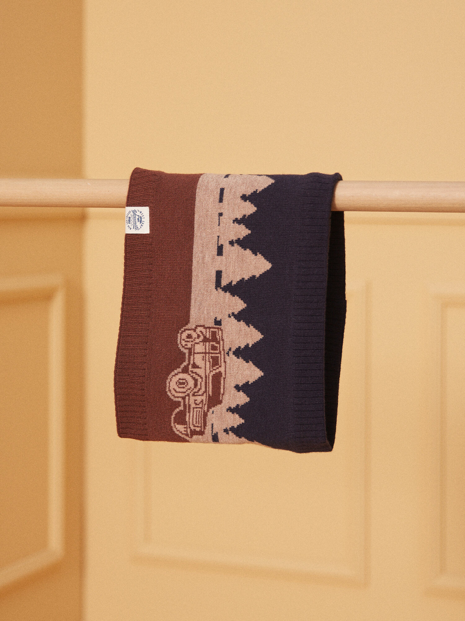Le snood est orné d’une étiquette tissée discrète sur le bas, gage de qualité et d’attention au détail. Sa doublure en polaire fine garantit chaleur et douceur, tandis que le tricot jacquard assure résistance et tenue dans le temps.