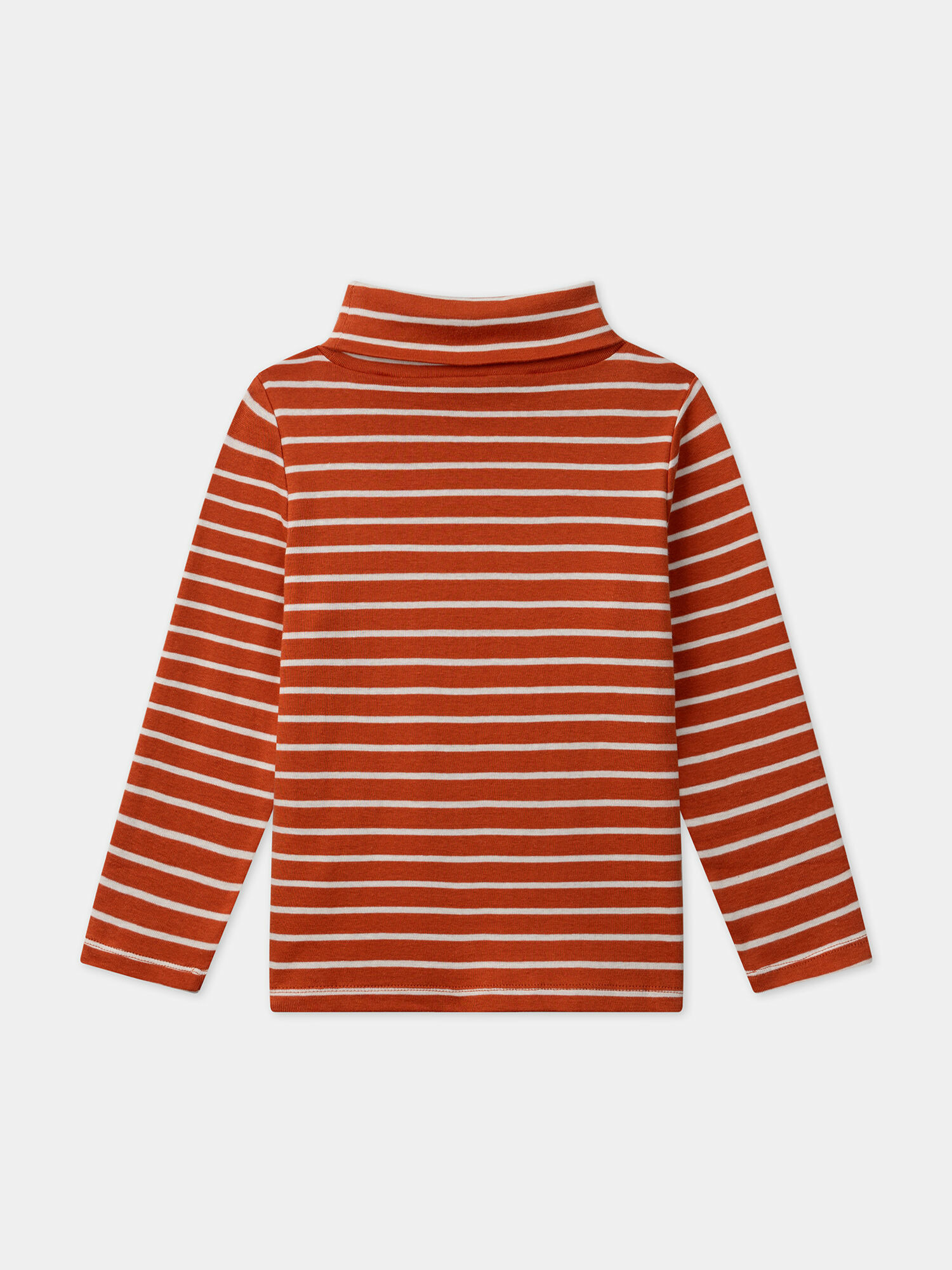 Ce sous-pull rayé orange allie chaleur et style avec son col roulé élégant. Son imprimé en relief sur la poitrine apporte une touche moderne qui dynamise chaque tenue.