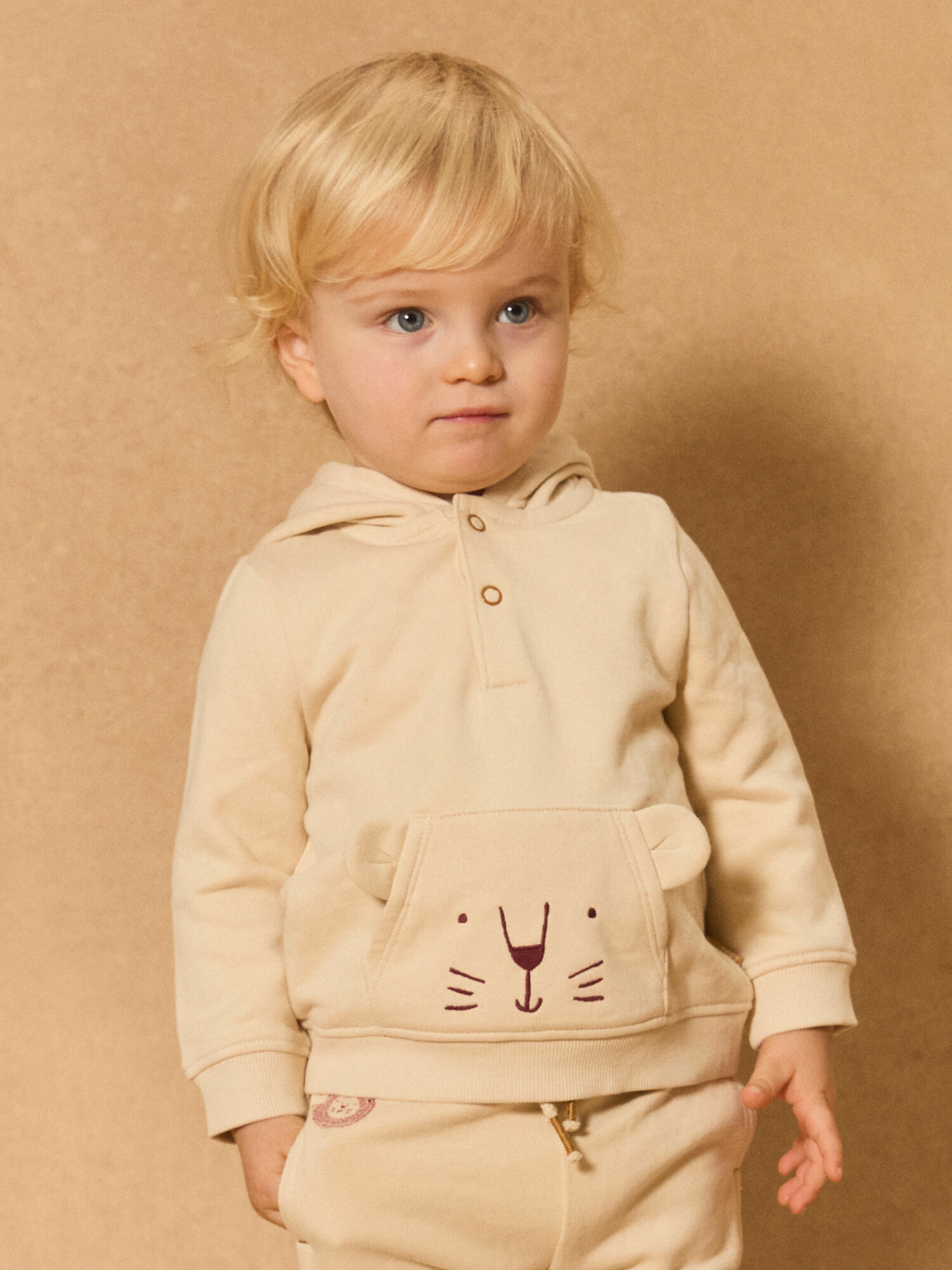 Confectionné pour les petits explorateurs, ce sweat à capuche séduit par sa poche kangourou ornée d’un visage d’animal brodé et ses oreilles en 3D qui stimulent l’imagination. La doublure imprimée lion marron apporte une note sauvage et chaleureuse, tandis que l’ouverture avant par boutons à pression facilite l’habillage au quotidien.