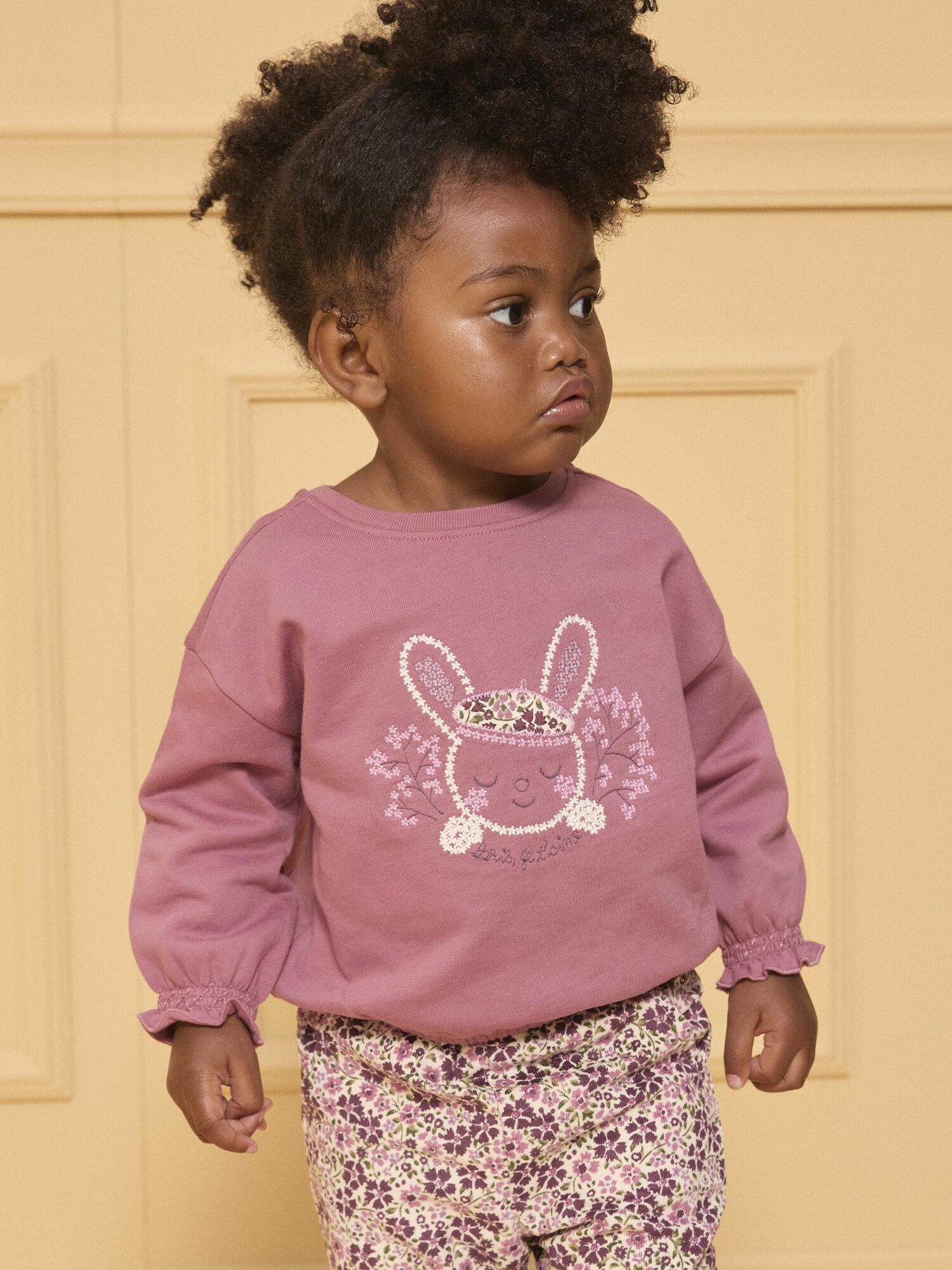 Ce sweat se distingue par son lapin brodé au centre, accompagné de l’inscription "Paris, je t’aime", qui apporte une touche poétique et raffinée. Sa coupe ample assure liberté de mouvement et confort tout au long de la journée, tandis que les poignets élastiqués avec smocks ajoutent une finition soignée et un ajustement parfait. L’ouverture dans le dos, facilitée par des boutons à pression, simplifie l’habillage sans compromettre le style.