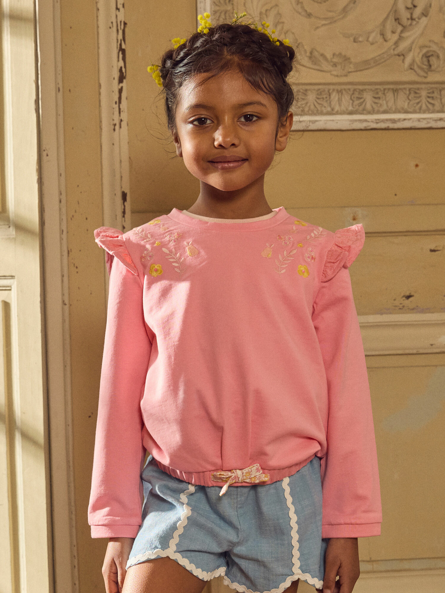Fabriqué dans le cadre de la collection Jaune de Tournesol, ce sweat intègre une taille élastiquée avec nœud décoratif, une ouverture au dos par boutons-pression, des broderies fleuries et des volants en broderie anglaise au niveau des épaules. Référence produit : MLASWETTE / 25E2PFK1SWED301. Pour découvrir ses qualités environnementales, consultez la fiche produit via le lien dédié.