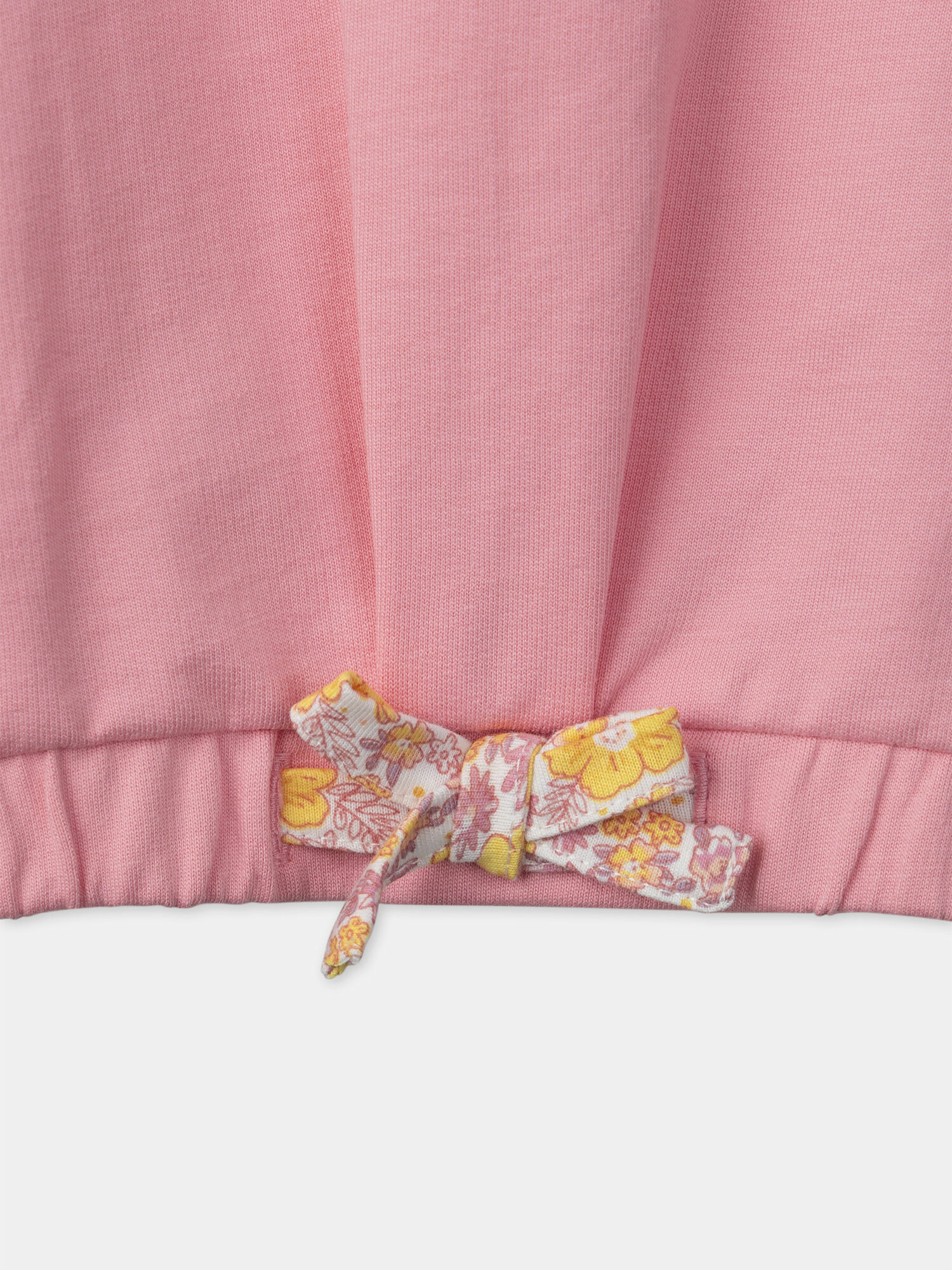 Ce sweat se distingue par ses broderies fleuries délicates et ses volants en broderie anglaise placés aux épaules, offrant un jeu de textures subtil et féminin. La taille élastiquée, agrémentée d’un nœud décoratif, souligne la silhouette tout en garantissant une aisance optimale. L’ouverture au dos par boutons-pression facilite l’habillage, rendant ce modèle aussi pratique que charmant.
