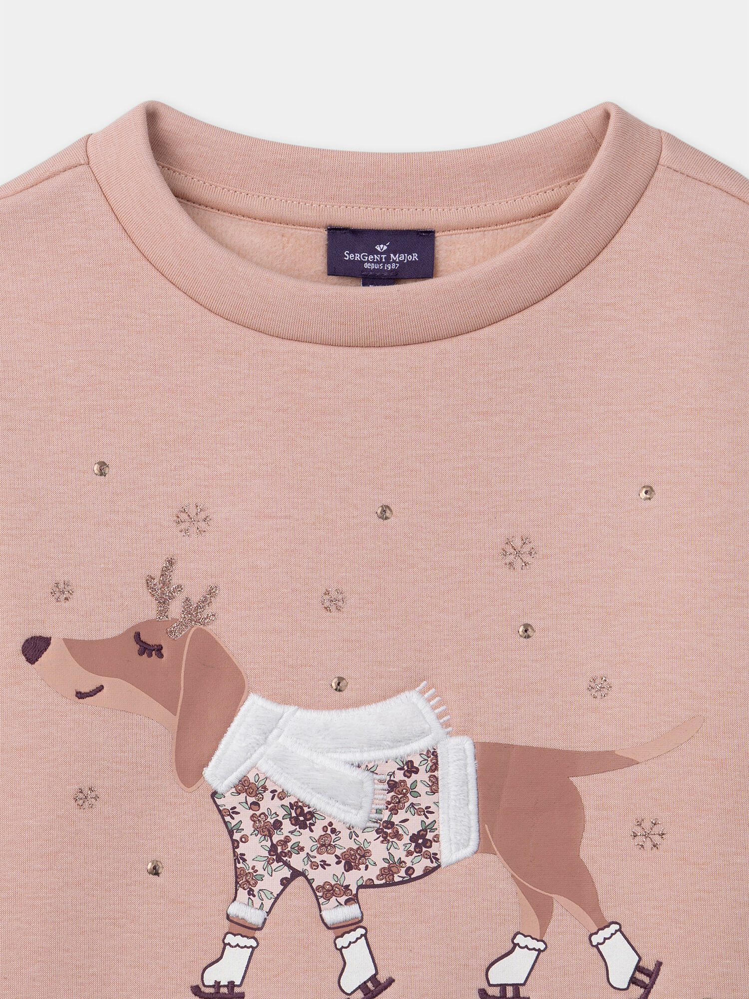 Fabriqué par Sergent Major, ce modèle fait partie de la collection Macarons à New York. Référence LOISWETTE / 24H2PFU1SWEK007. Matière principale : sweat doublé polaire. Détails : minis volants en broderie anglaise aux emmanchures, imprimé chien.