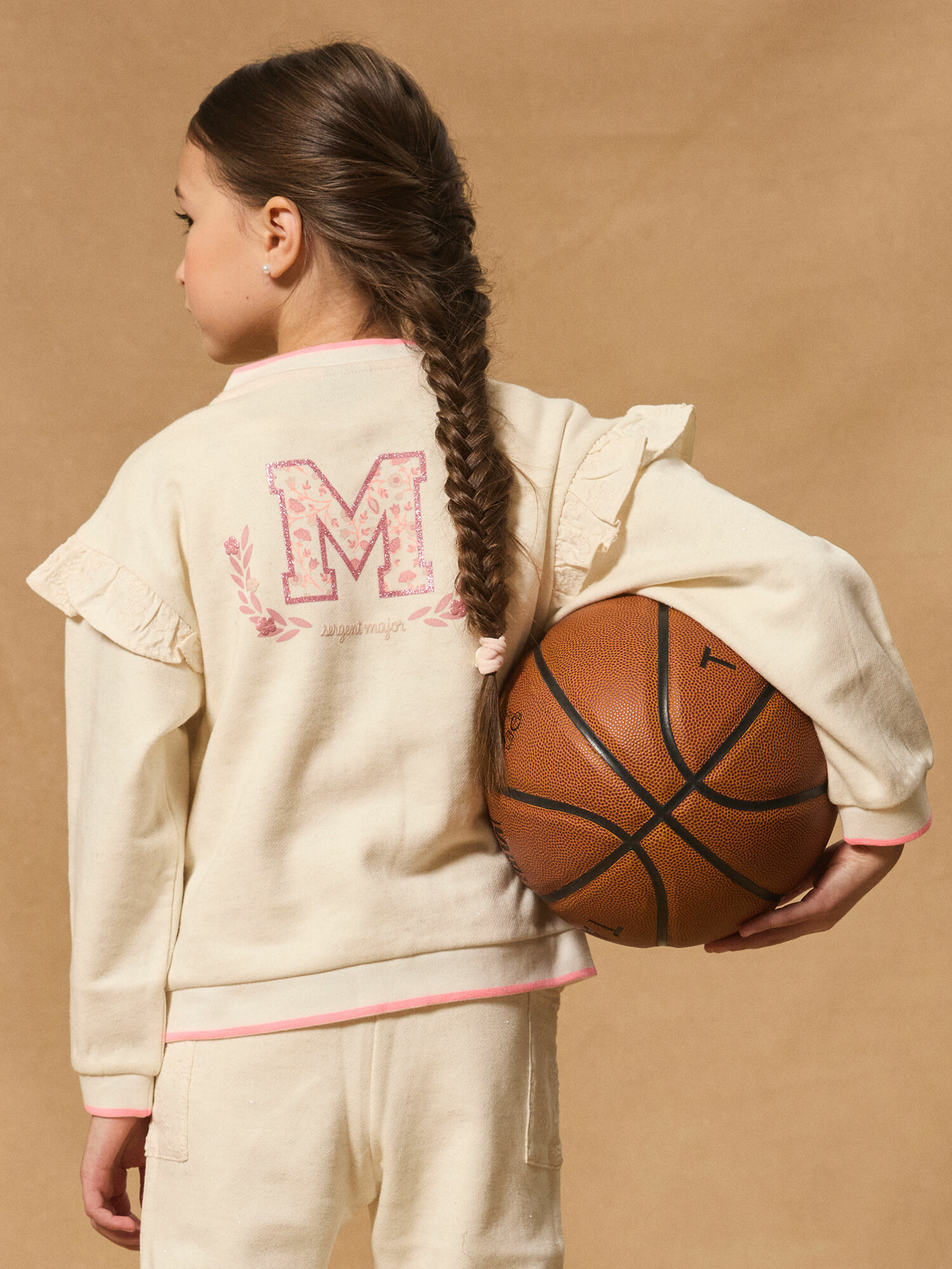 Sweat zippé chiné avec volants aux épaules, détails en fils métallisés, deux poches avant, ouverture zippée sur le devant. Ce modèle fait partie de la collection Mix Major. Pour plus d’informations sur ses qualités environnementales, consultez la fiche produit dédiée.