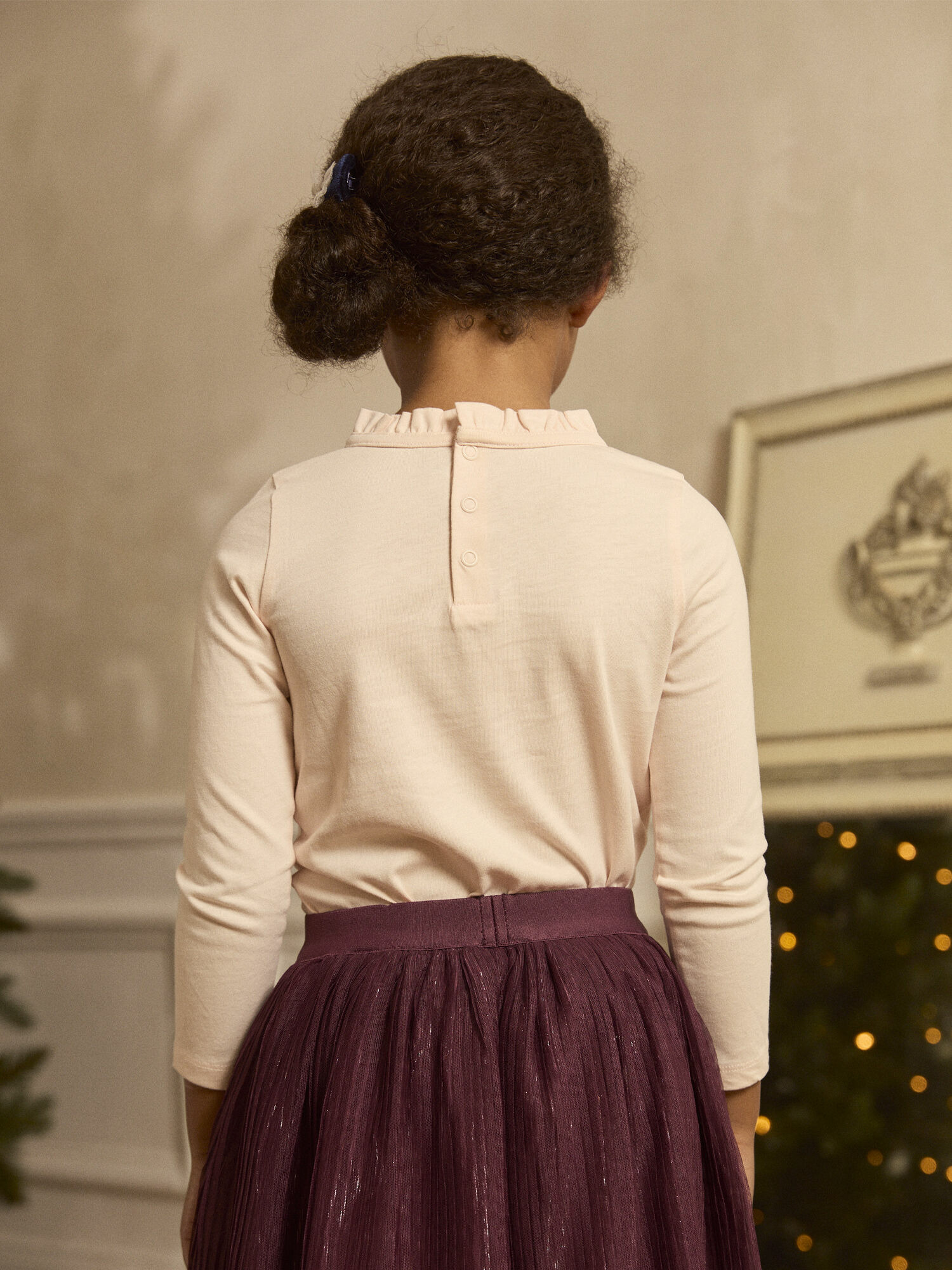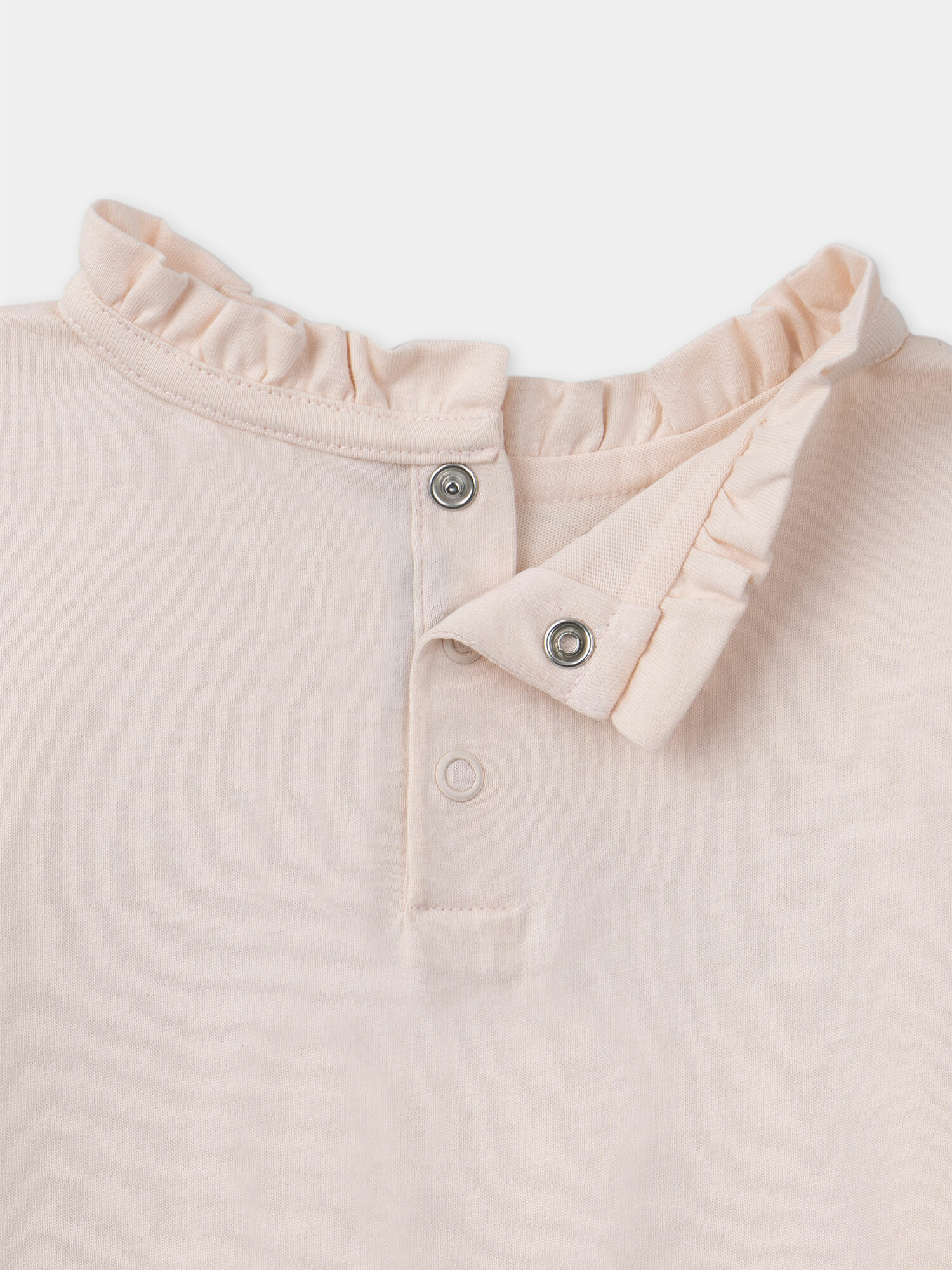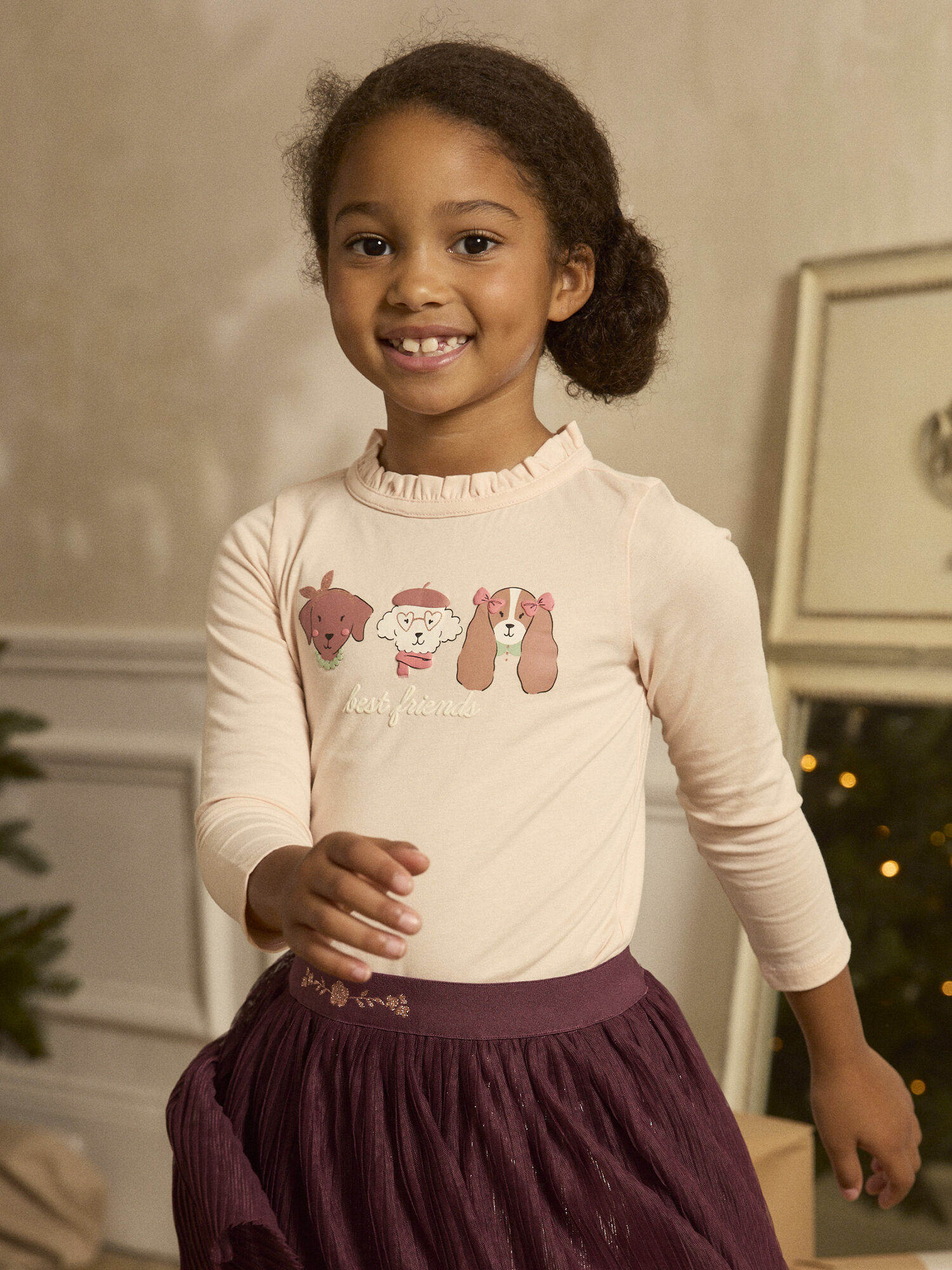 Conçu pour allier style et confort, ce t-shirt joue la carte de la fantaisie avec ses motifs canins joyeux et ses volants subtils qui apportent une touche féminine sans excès. Facile à enfiler grâce aux boutons-pressions au dos, il accompagne les journées actives des enfants tout en restant léger et agréable à porter. Ce modèle fait partie de la collection Macarons à New York, une série qui mêle fraîcheur et tendresse.