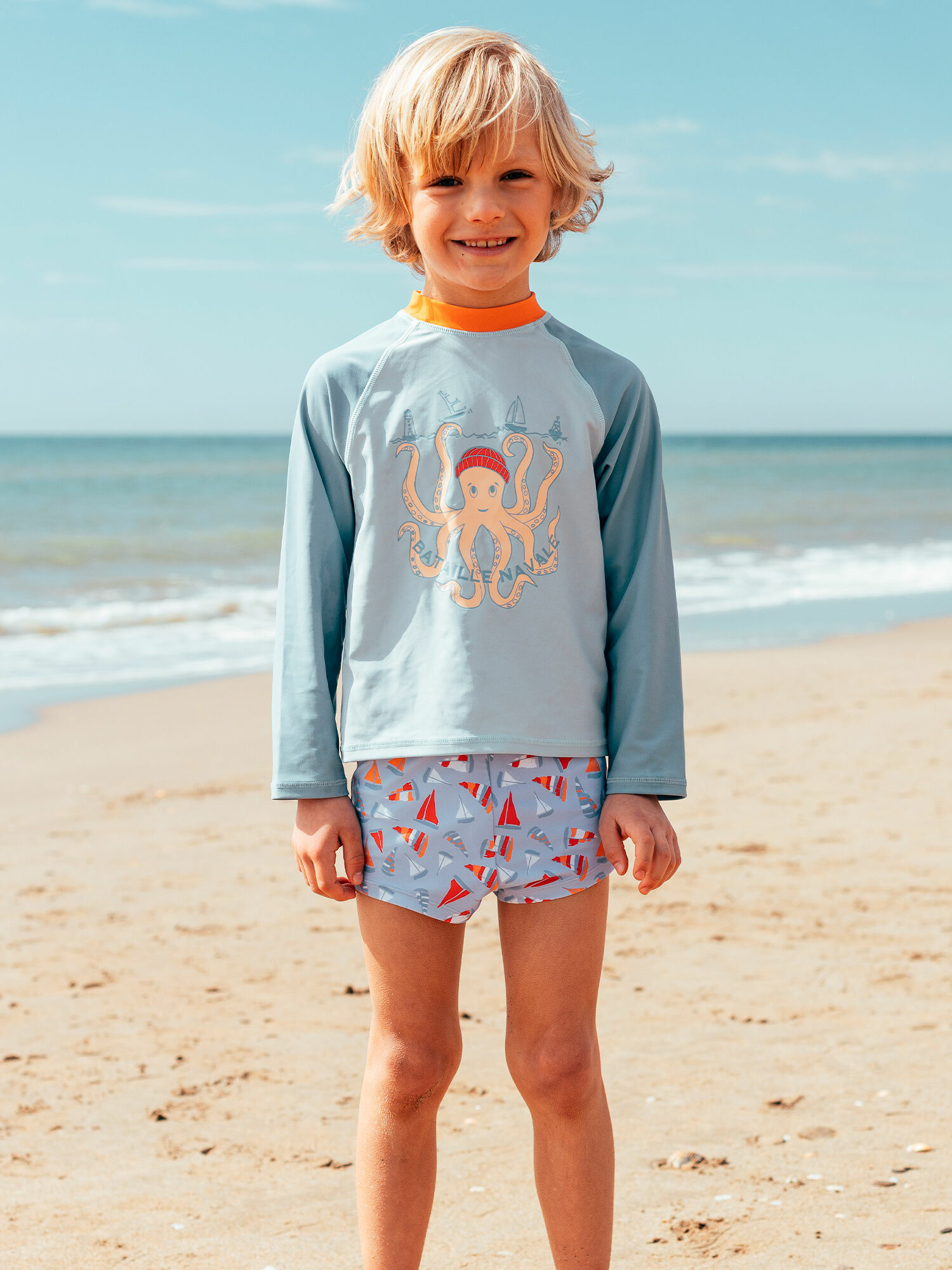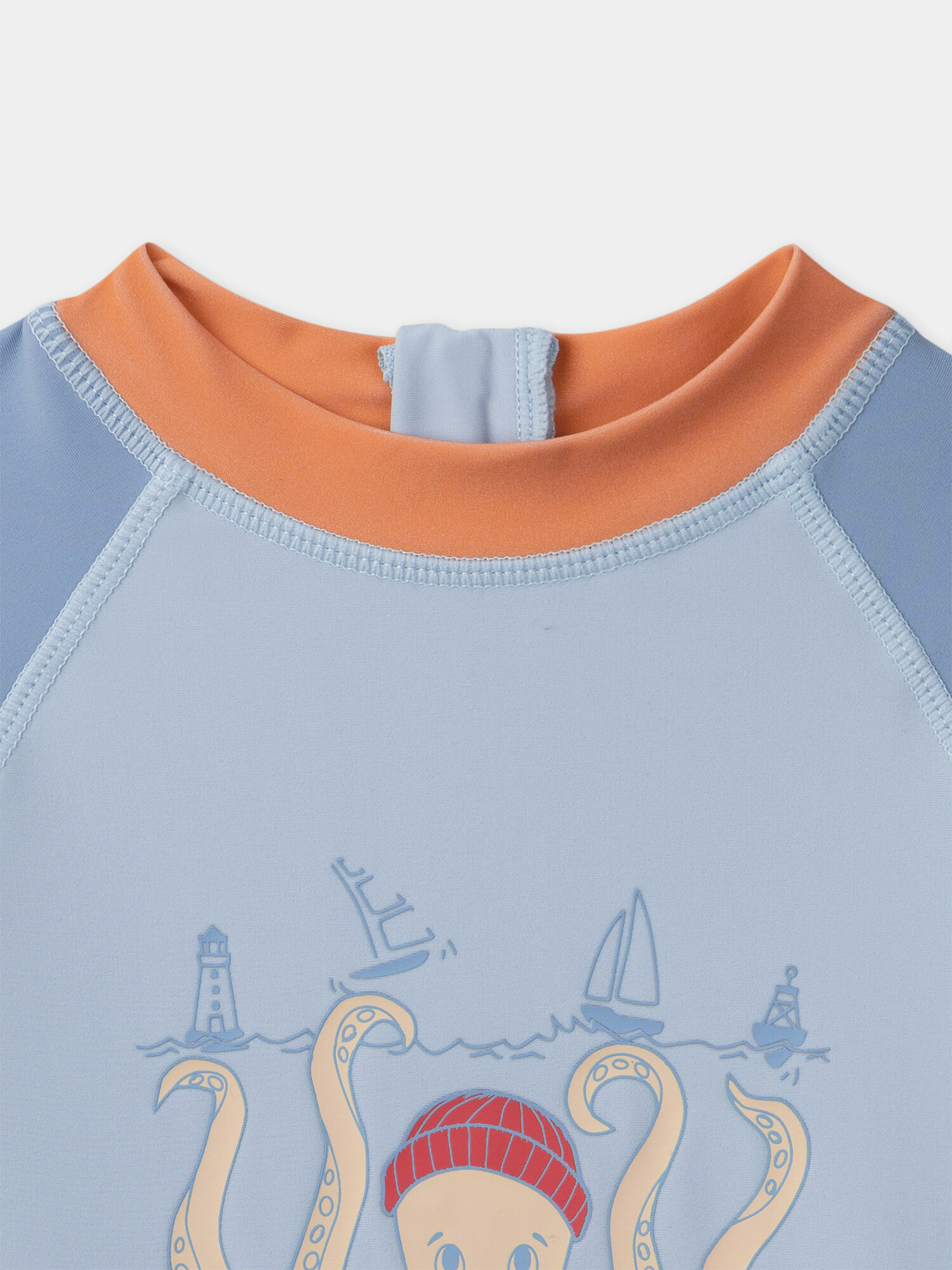Impression pieuvre et navires sur le devant. Manches longues raglan. Fermeture éclair à l’arrière. Col uni orange. Compatible avec le boxer MRUBATAGE et le short MRUMOUAGE. Produit issu de la collection Plage. Référence MRUPOUAGE / 25E4PGC4TUV020.