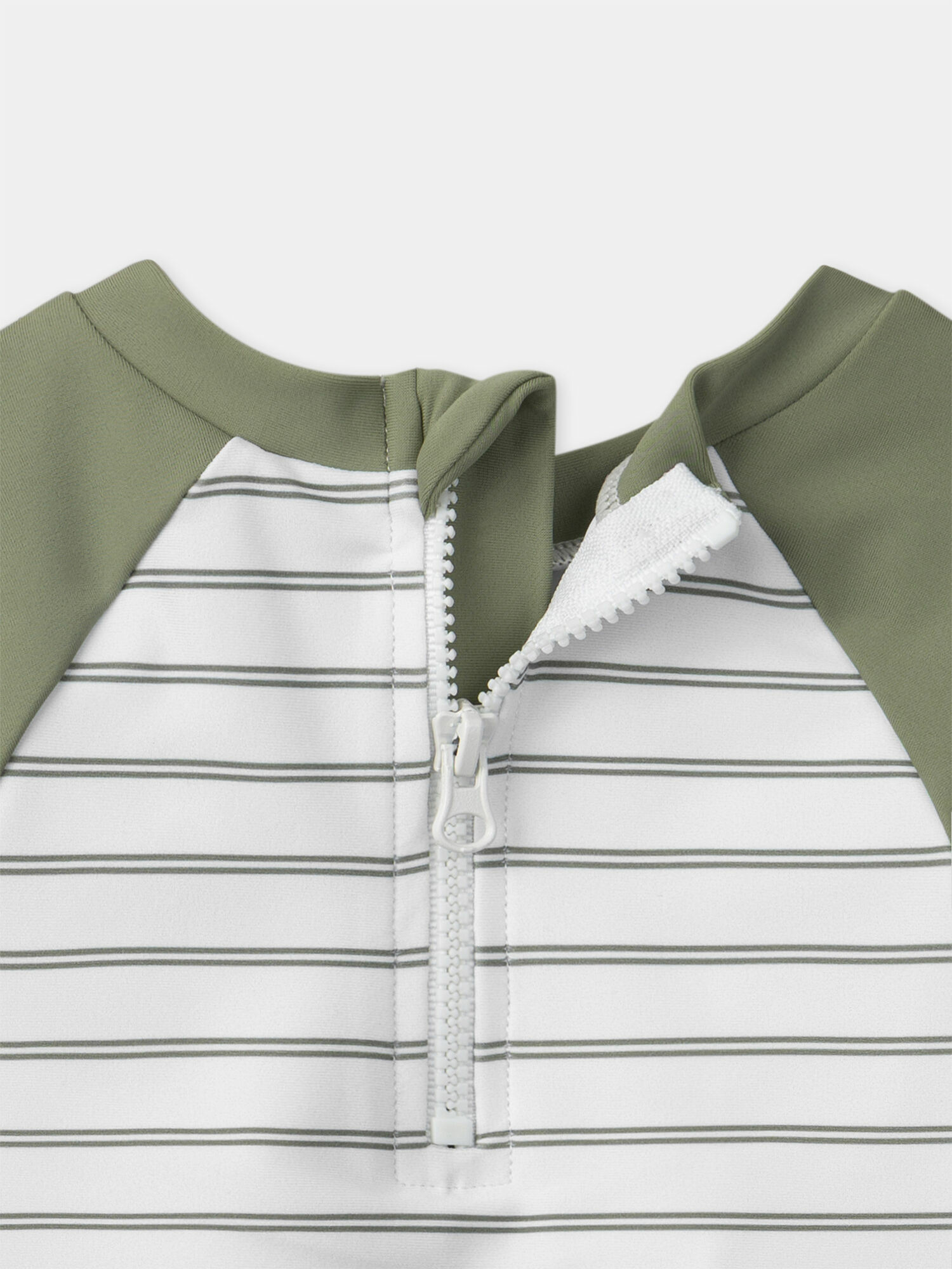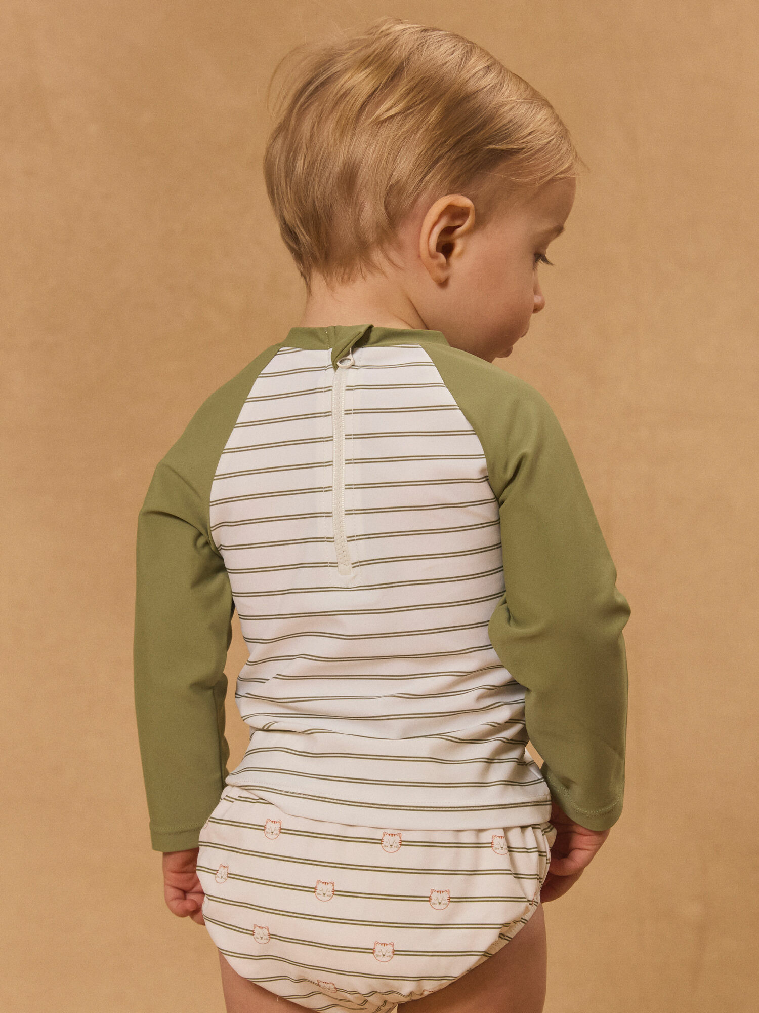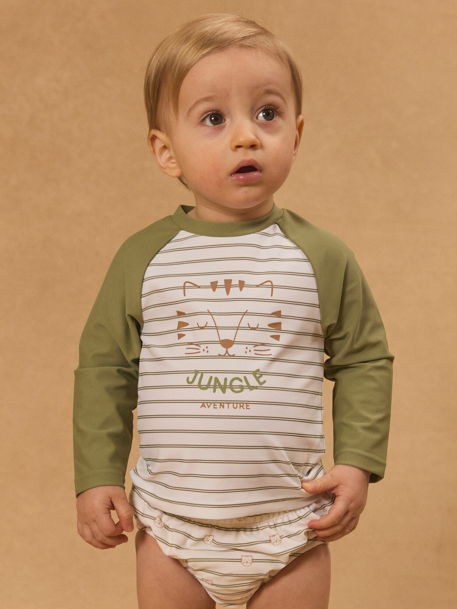 Ce t-shirt de bain affiche des rayures kaki et écru, rehaussées d’une impression tête de tigre et du slogan "jungle adventure" sur le devant, pour un look à la fois dynamique et tendance. Ses manches longues unies kaki et ses emmanchures raglans assurent une liberté de mouvement optimale, tandis que la fermeture à glissière à l’arrière facilite l’enfilage. Pensé pour accompagner les journées ensoleillées, il s’accorde parfaitement avec la culotte MISOREN et le short MISACHA de la même collection.