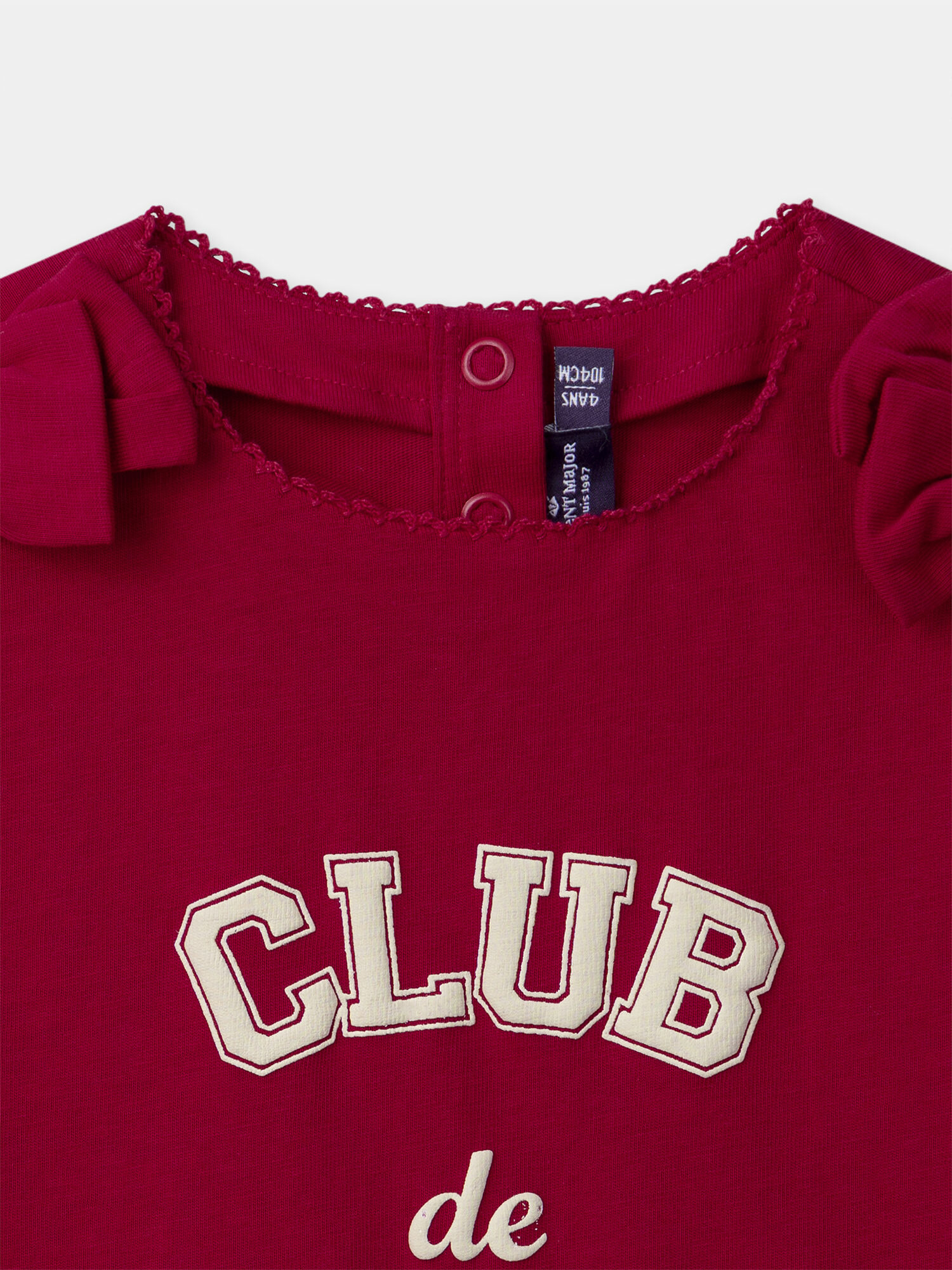 Conçu pour les saisons douces, ce t-shirt à manches courtes séduit par ses finitions délicates. Les nœuds placés aux épaules apportent une touche coquette tandis que les bordures festonnées en croquet au col et aux manches renforcent son élégance subtile. L’ouverture dans le dos avec boutons-pression facilite l’habillage, un vrai plus pour les enfants pleines d’énergie.